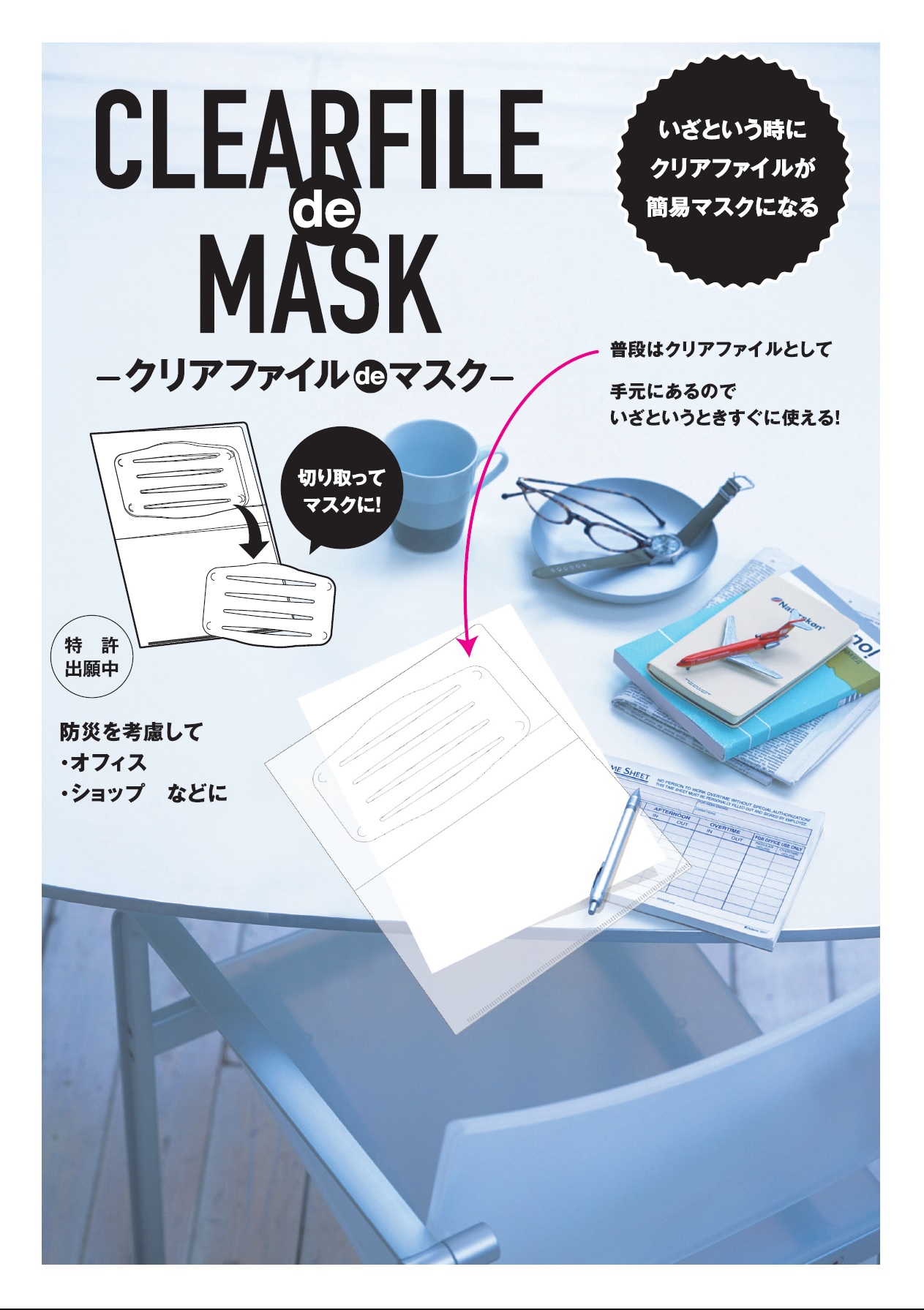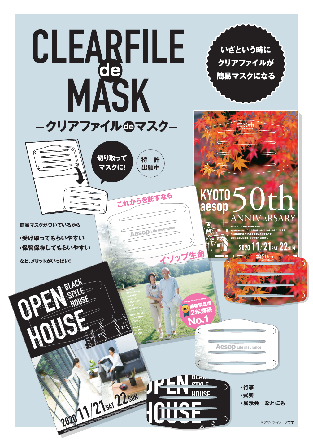この利便性とクリアファイル自体の素材を生かして、加陽印刷株式会社 と 株式会社イソップ企画が「イザという時にクリアファイルが簡易マスクに【クリアファイル de マスク】※特許出願中 (https://cf-desi.com/order/mask.html)」を共同開発しました。