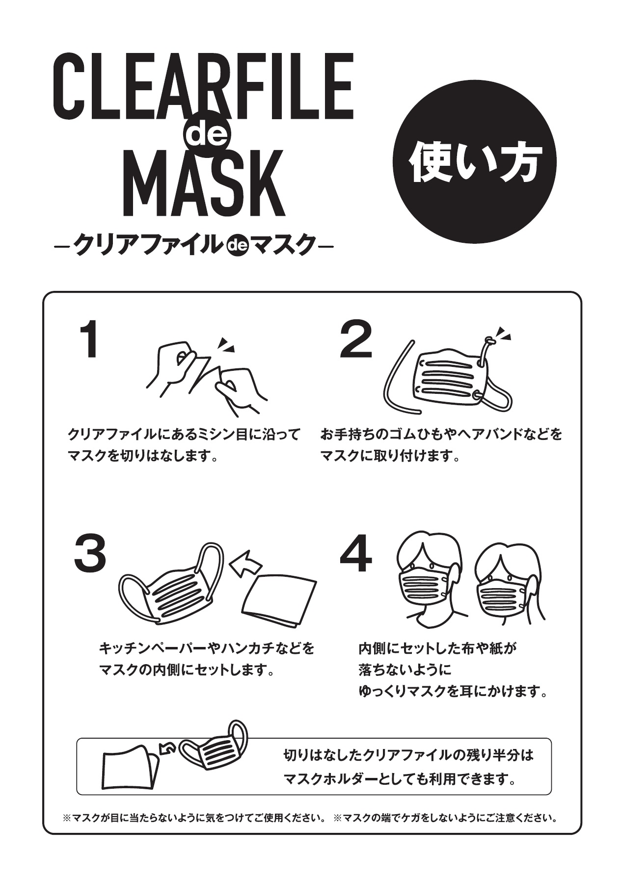 A4サイズのクリアファイルが、上半分を切り取ると「簡易マスクカバー」となり、残った半分もA5のクリアファイルとしても利用できるので大変便利です。