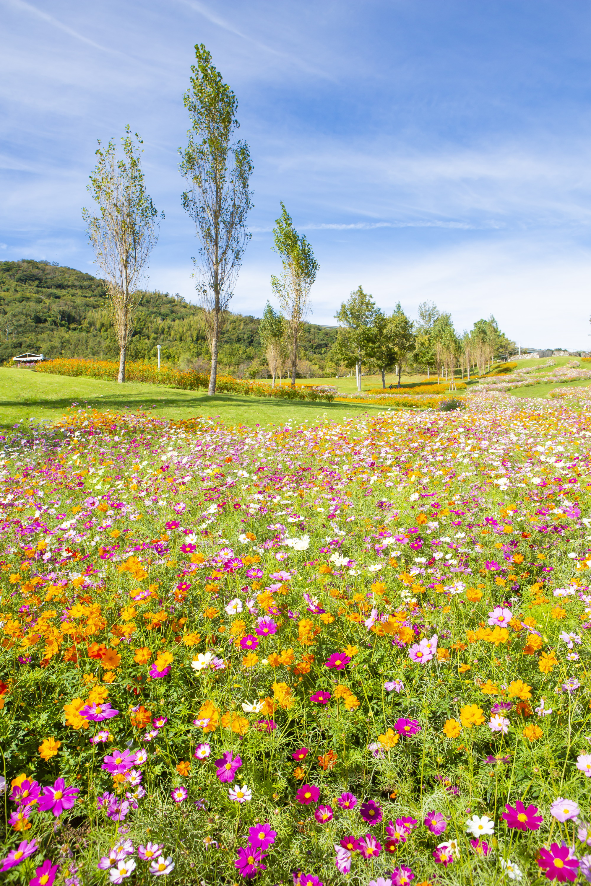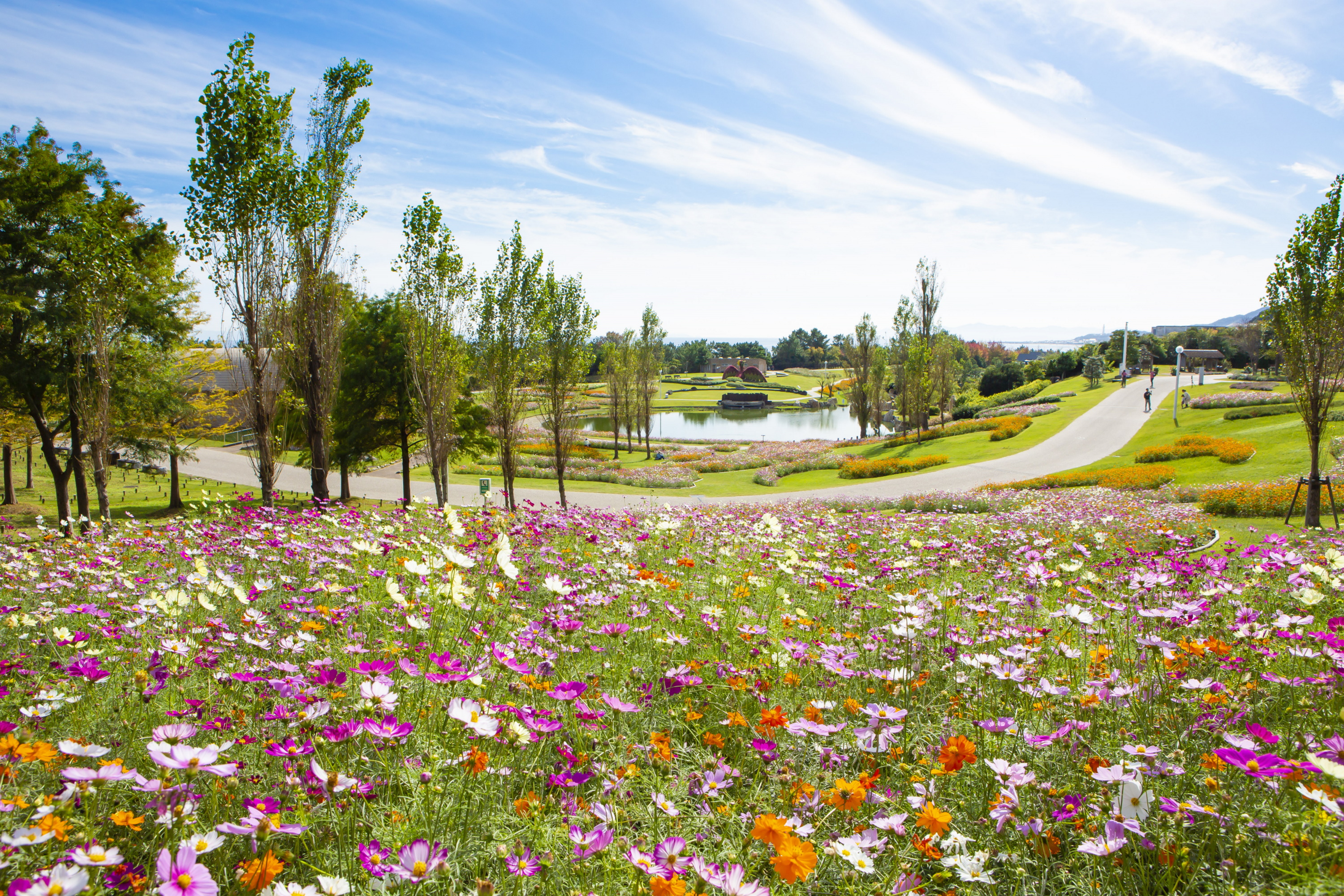▷ 園内に赤や白やピンクなどカラフルな10万本のコスモスが咲き誇る大花畑