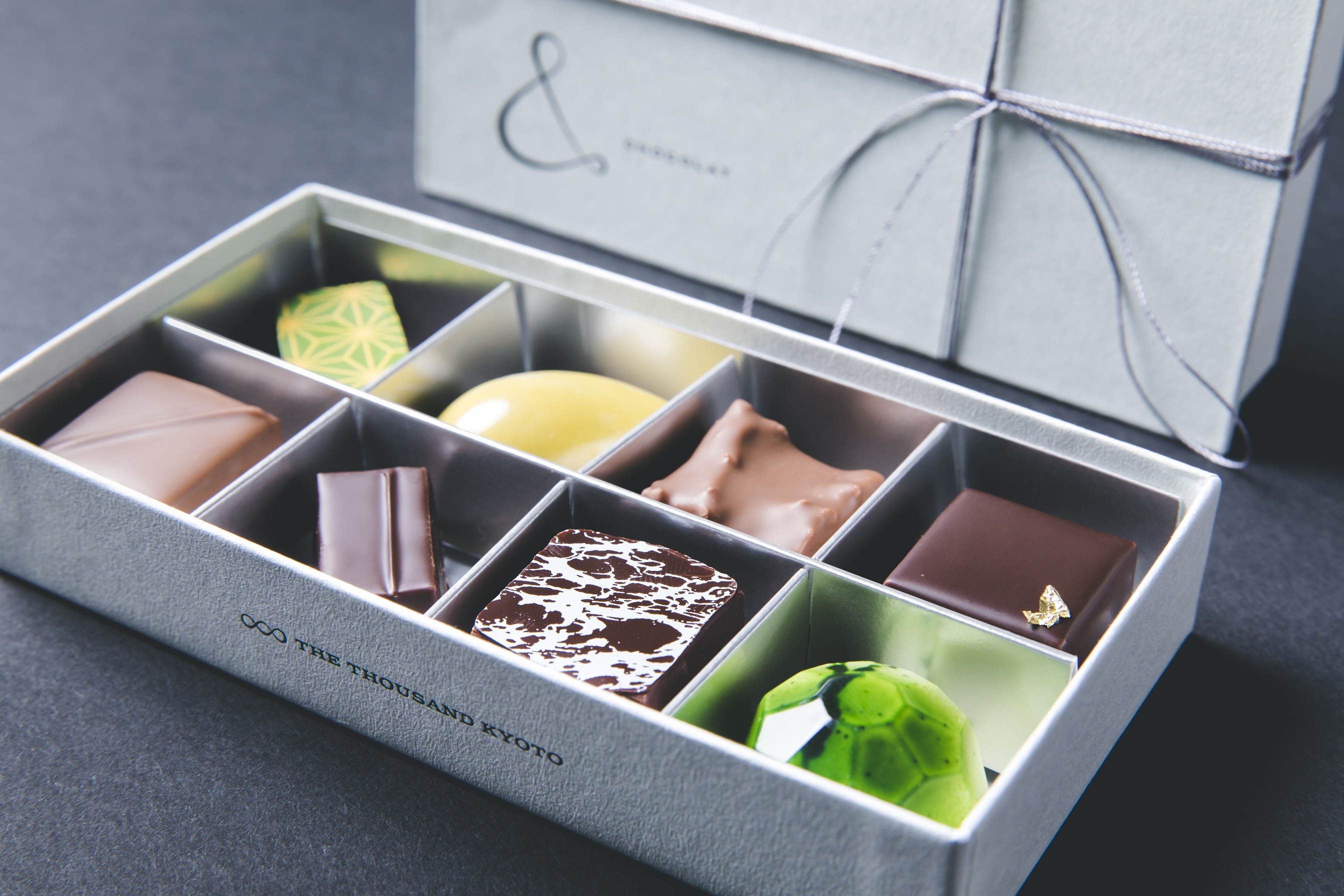 THE THOUSAND KYOTOのパティシエがひとつひとつ丁寧に作り上げる8種類のボンボンショコラアソート。まるで繊細な宝石が並ぶジュエリーボックスを思わせ、ずっと眺めていたくなるような自慢のショコラです。宇治抹茶、ほうじ茶、柚子、黒七味など京都らしい素材や、ジャスミンティーにチャイ、アールグレイといった“茶”フレーバーなど、本格的なお茶を様々なスタイルで楽しめる「TEA&BAR」ならではのラインナップです。