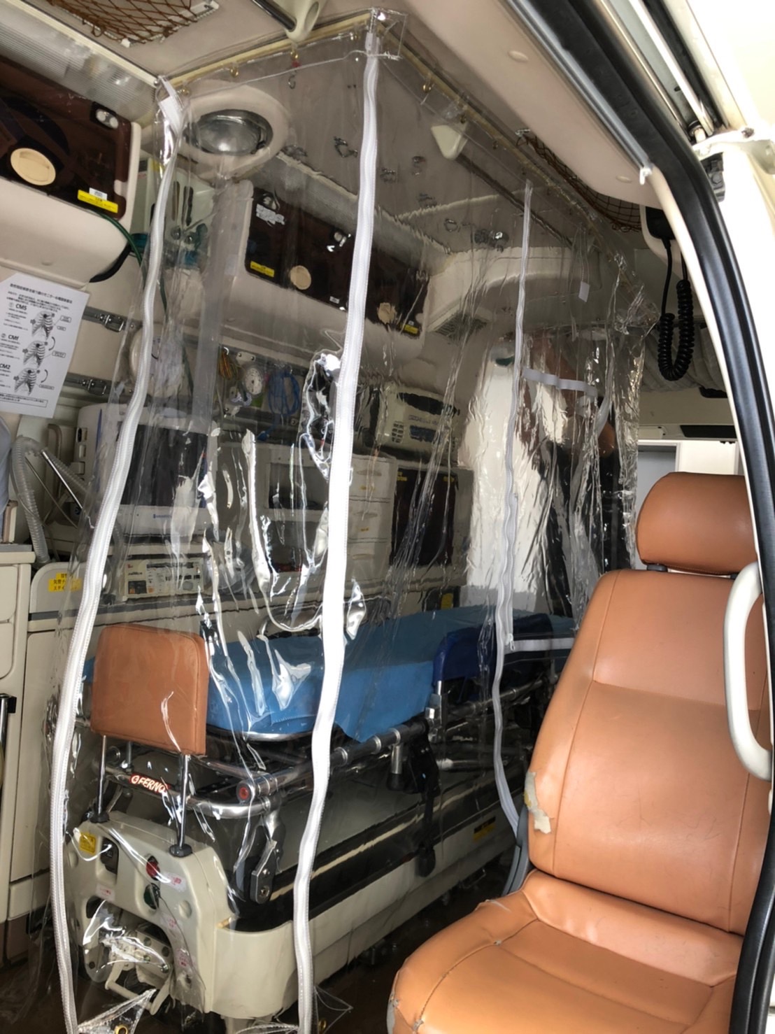 当社では新型コロナウイルス感染症の感染拡大防止のため、救急隊への感染防止が急務と考え、救急車内に設置する感染防止用カーテンを2セット製作し、2020年5月21日に堺市消防局に寄贈しました。チャックを装備しており、最小限の接触でコロナ疑いのある患者を安全に搬送することができます。