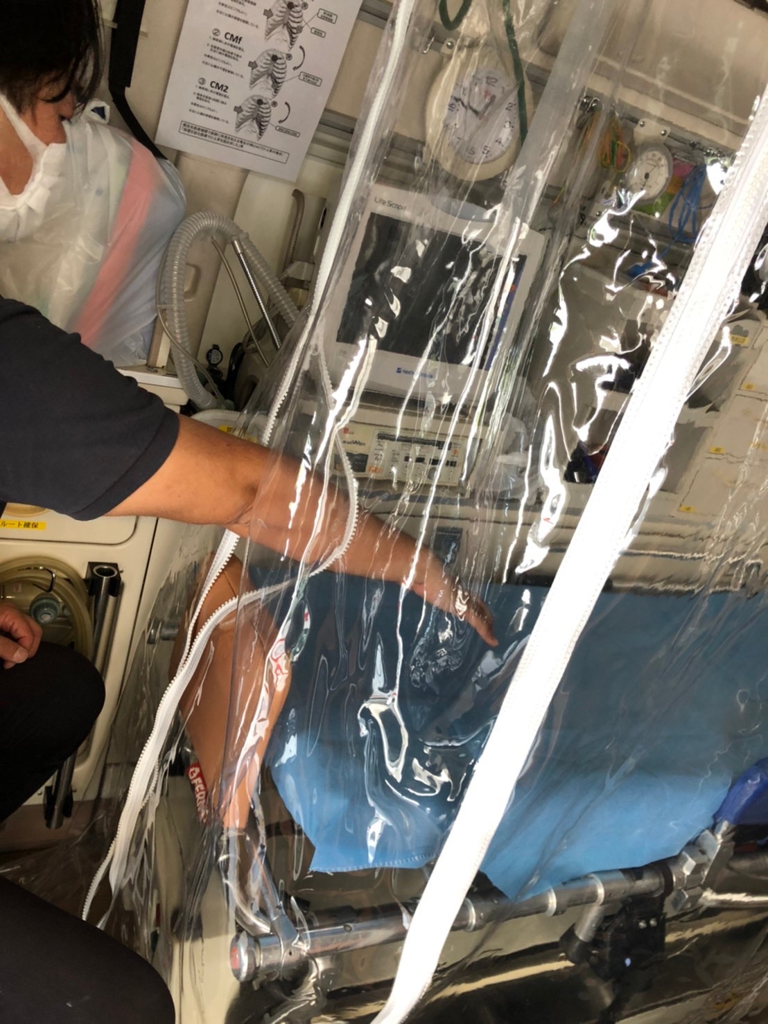 このストレッチャーカバーはもともと、救急車に乗せる際の「患者のプライバシーを守る」ことと、雨天時の「雨よけ」のニーズがあったことから考案していたものですが、コロナ対策にも有効と考え、開発を急いだものです。カバーがあることで飛沫を防ぐことができるだけでなく、上面を透明にすることで患者の様子を常に見ることができ、急変に対応することができます。