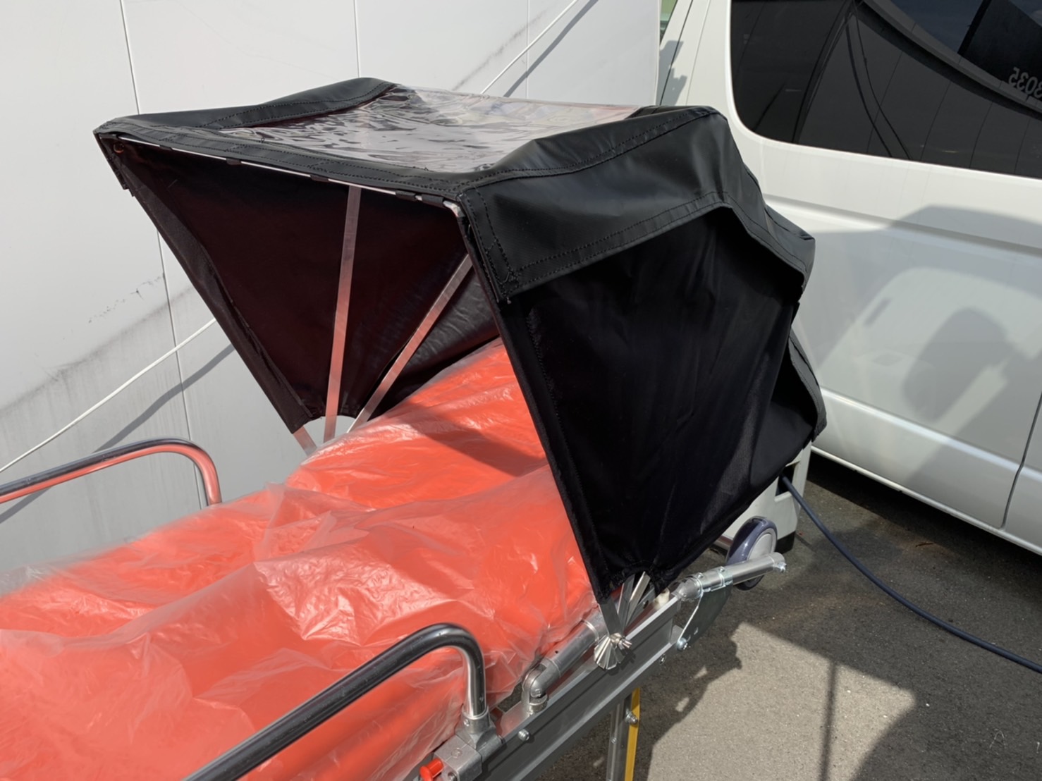 今回第2弾として開発したストレッチャーカバーは、救急車に患者を乗せる際に使用するストレッチャーに装着する顔面部分のカバーです。開け閉めができるため必要に応じて使うことができます。