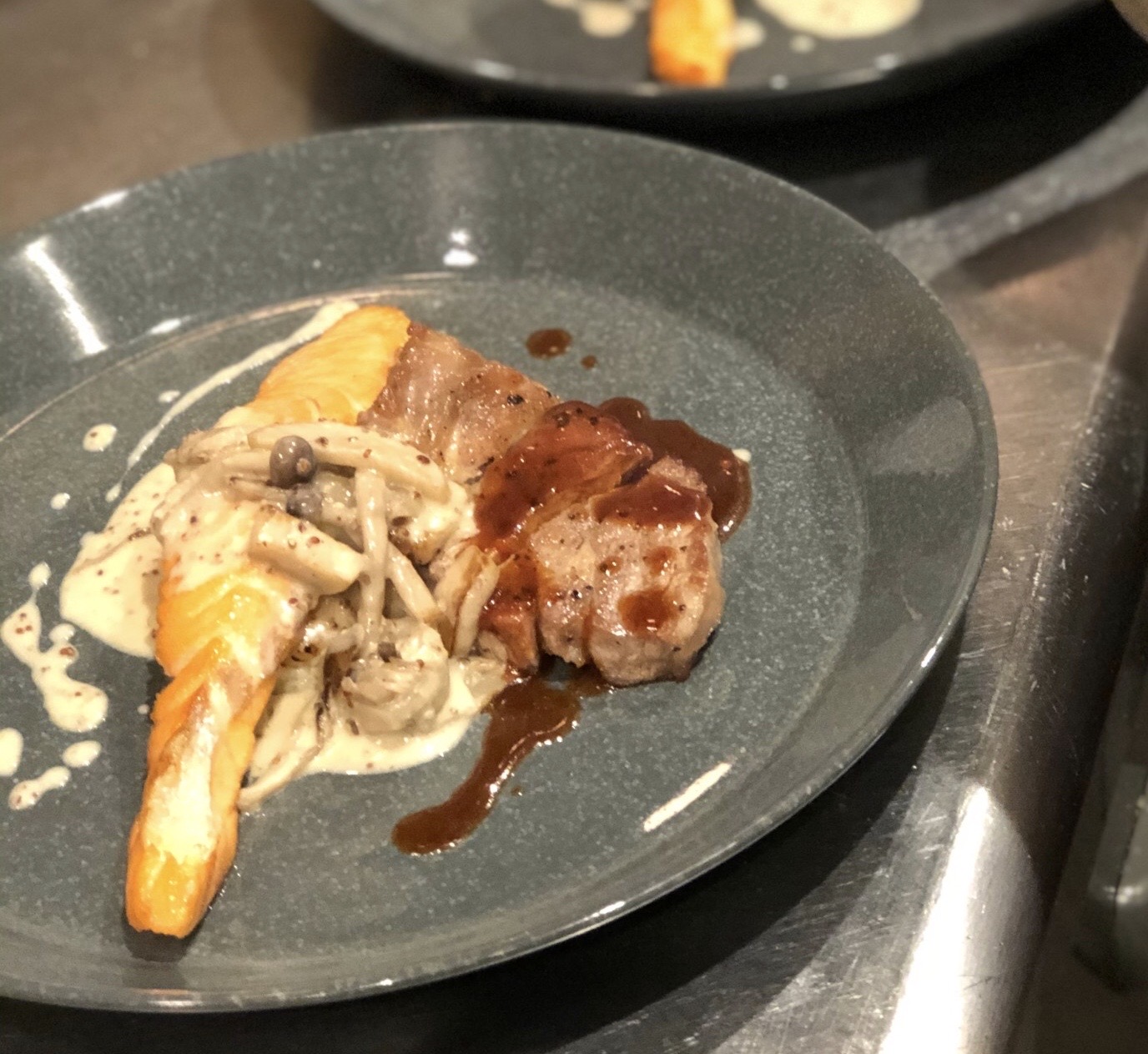 ・サーモンとローストポークのメイン