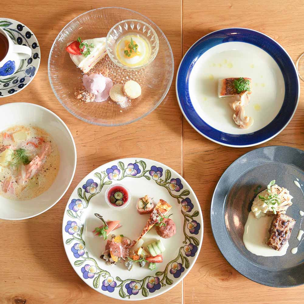 フィンランド人スタッフも加わりメニュー開発した、ケイットルオカラ特製の北欧創作料理のフルコース、彩り鮮やかなテーブルコーディネートと北欧食器、そしてゆったりとした時間。