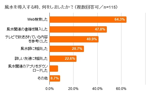 では、どのような方法で風水を導入したのでしょうか。最も多かった回答は「Web検索した」(64.3%)で、以下「風水関連の書籍を購入した」(47.8%)、「テレビで放送されている内容を参考にした」(40.9%)、「風水師に相談した」(28.7%)、「詳しい友達に相談した」(22.6%)、「風水関連のアプリをダウンロードした」(7.0%)、「その他」(8.7%)となりました。