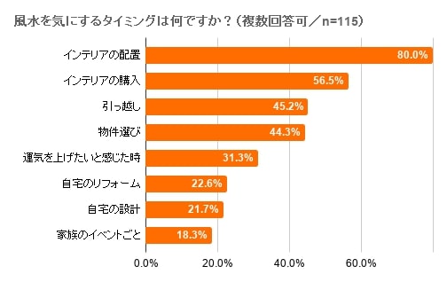 「気にする」並びに「多少気にする」と回答した方に、どのような時に風水が気になるのかたずねました。「インテリアの配置」(80.0%)や「インテリアの購入」(56.5%)と回答した方が半数以上おり、「運気を上げたい」(31.3%)の他、「引っ越し」(45.2%)、「物件選び」(44.3%)、「自宅のリフォーム」(22.6%)、「自宅の設計」(21.7%)など転居や家作りのタイミングで気にし、住まいそのものを運気アップさせたいと思っている方も多くいることがわかりました。