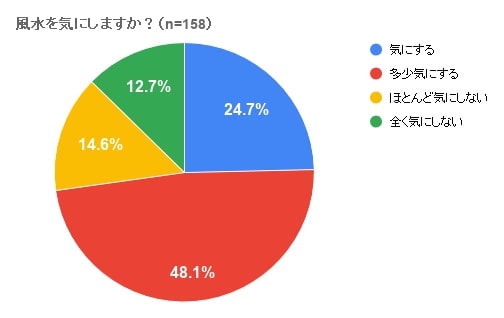 一般的に取り入れやすいと言われる風水。実際どれくらいの方が気にしているのかたずねてみました。「多少気にする」(48.1%)が最も多く、次いで「気にする」(24.7%)、「ほとんど気にしない」(14.6%)、「全く気にしない」(12.7%)となり、多少なりとも気にする人が72.8%もいることがわかりました。