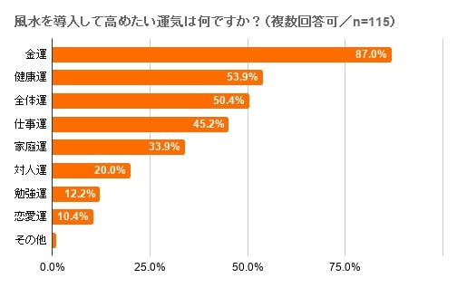 最後に、風水で高めたい運気は何かたずねたところ、「金運」(87.0%)が2位の「健康運」(53.9%)を大きく引き離しダントツの1位。3位以下は「全体運」(50.4%)、「仕事運」(45.2%)、「家庭運」(33.9%)、「対人運」(20.0%)、「勉強運」(12.2%)、「恋愛運」(10.4%)、「その他」(0.9%)という結果でした。