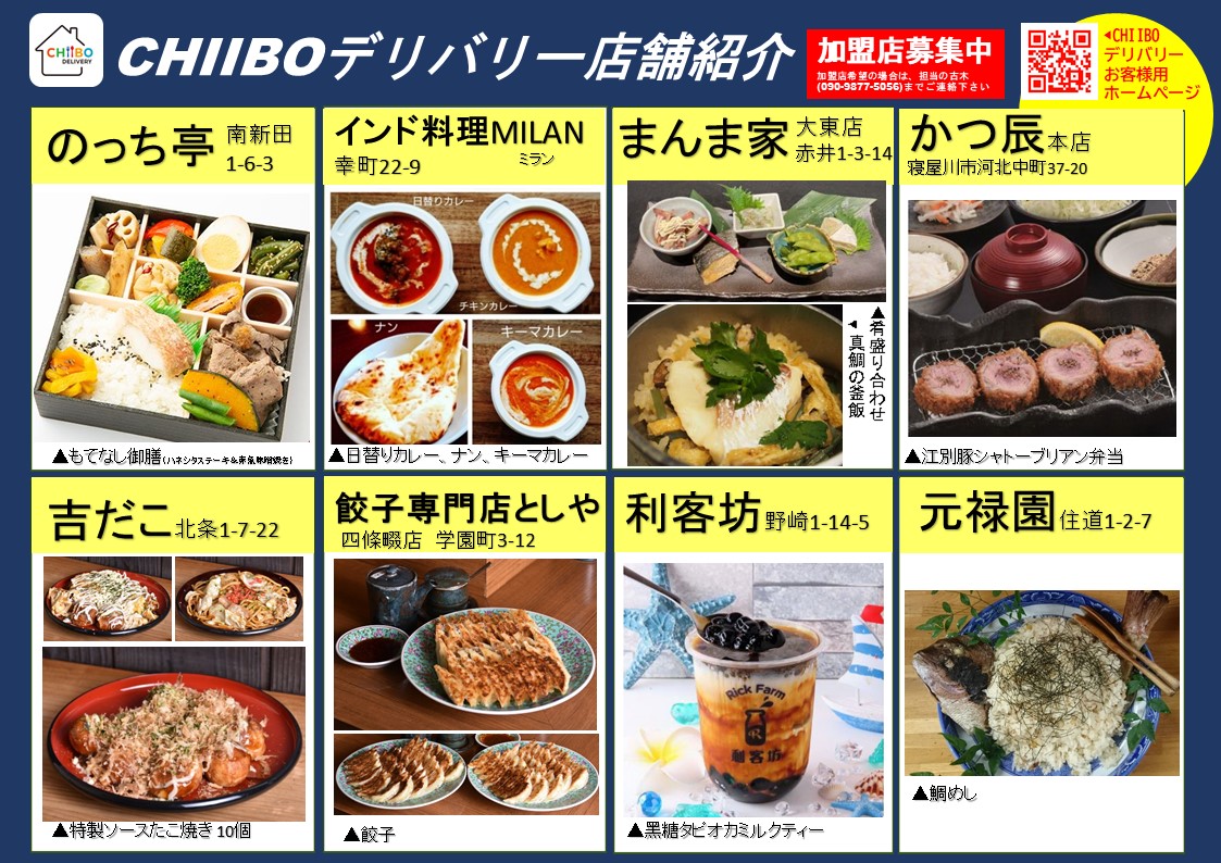 地元企業のマココロ株式会社(本社:大阪府寝屋川市 代表取締役:栗田太樹)が令和2年6月に立ち上げた地域密着型のデリバリーサービス。大東市・四條畷市・寝屋川市のお店の半径3キロ圏内の場所に届けることができます。運営手数料は15%で、大手デリバリーサービスに比べると安くなっており、個人が経営する店舗にも負担にならないように運営を行っています。