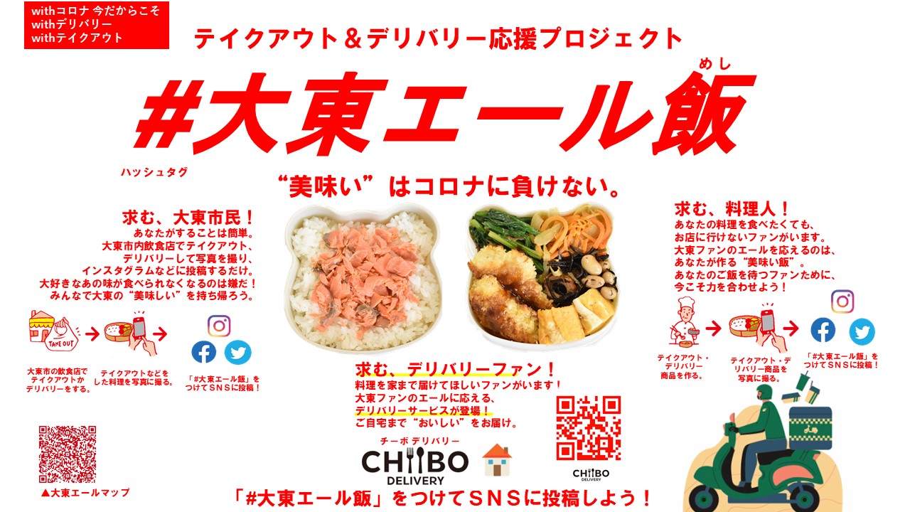 新型コロナウイルス感染症の影響で、営業を縮小している市内飲食店を盛り上げるために、テイクアウト(お持ち帰り)や、デリバリー(お届けサービス)などをしているお店をインスタグラムやフェイスブックで募集しています。「#大東エール飯」とハッシュタグを付けて投稿することによって、市内の飲食店をPRします。