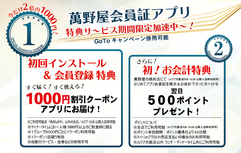 株式会社萬野屋(本社:大阪市天王寺区国分町21-40ガード下番号68-70、代表取締役:萬野和成)が運営する焼肉店9店舗で、政府と大阪府の飲食店支援策「Go To Eatキャンペーン」と「『少人数利用』飲食店応援キャンペーン」を併用した5,500円(税込)プランを、オンライン飲食予約サイトで順次予約を開始いたします。さらに10月7日(水)より、当社の公式アプリをダウンロードいただいたお客様1人につき、当日より利用可能な1,000円分のポイントを進呈いたします。