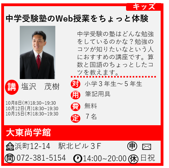 大東Web ゼミとは、ZOOM(Web 会議ツール)を活用し、大東市内の様々なお店の店主が講師となり、プロならではの専門的な知識や情報、コツを無料で受講者(お客様)にお伝えする少人数制のゼミです。ゼミを通して、お店や商店主の存在・特徴を知っていただくとともに、お店とお客様のコミュニケーションによって、信頼関係を築くことを目的としています。当日は、学習塾やハープ演奏者、税理士、眼鏡屋など様々なお店が参加する予定です。