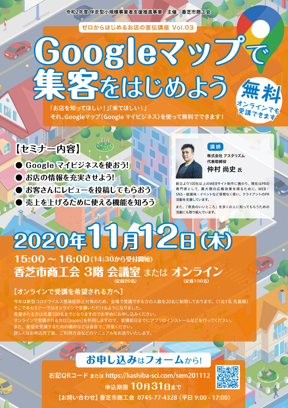 香芝市商工会(所在地:奈良県香芝市)は、「お店を知ってほしい!」「来てほしい!」事業者のために「Googleマップで集客をはじめよう」セミナーを、オンラインでも受講できる形式で開催することをご報告いたします。