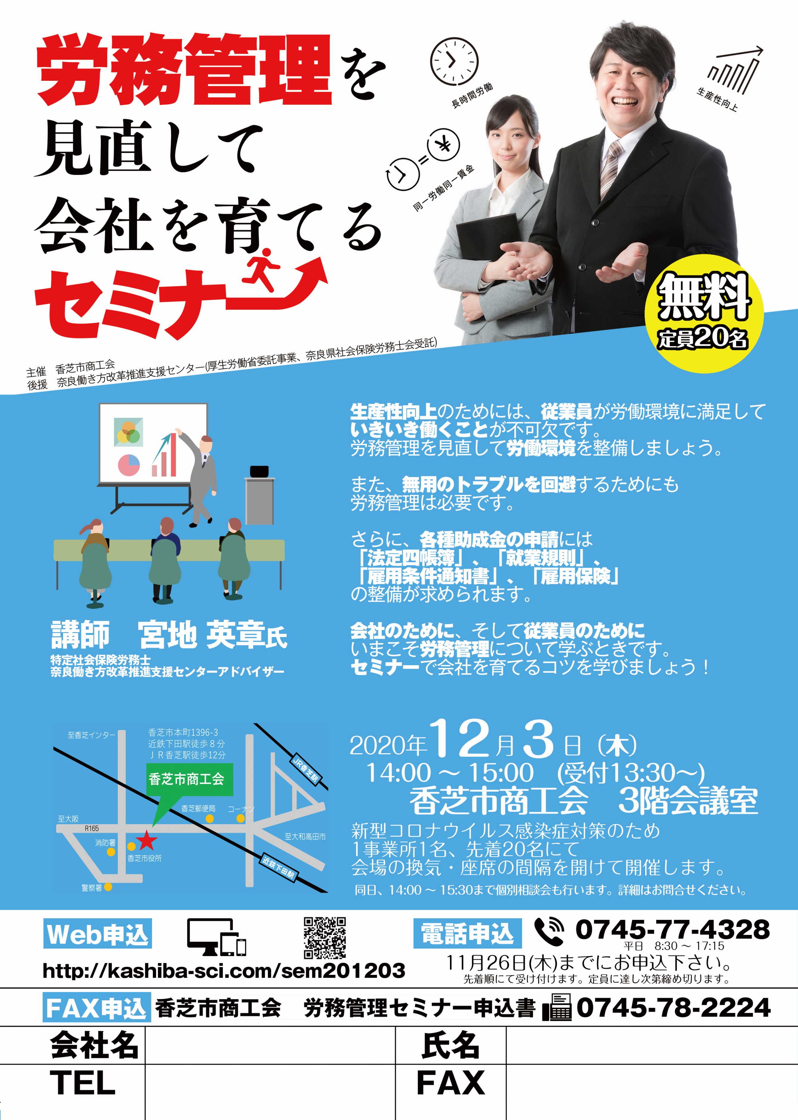 香芝市商工会(所在地:奈良県香芝市)は、ウイズコロナ・アフターコロナにおいて雇用調整助成金などの活用を目指す事業者のために2020年12月3日(木)に「労務管理を見直して会社を育てるセミナー」と個別相談会を開催することをご報告いたします。