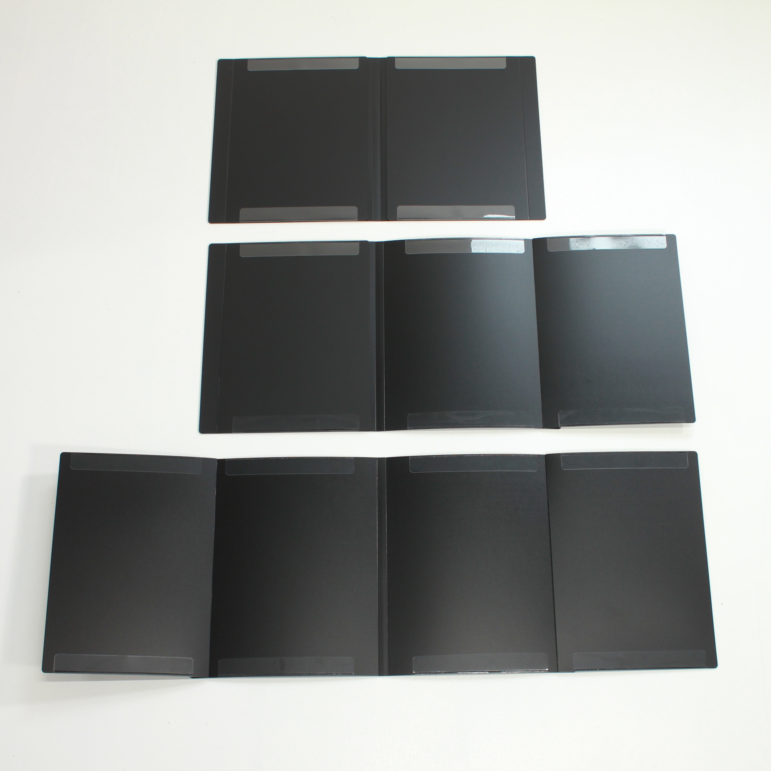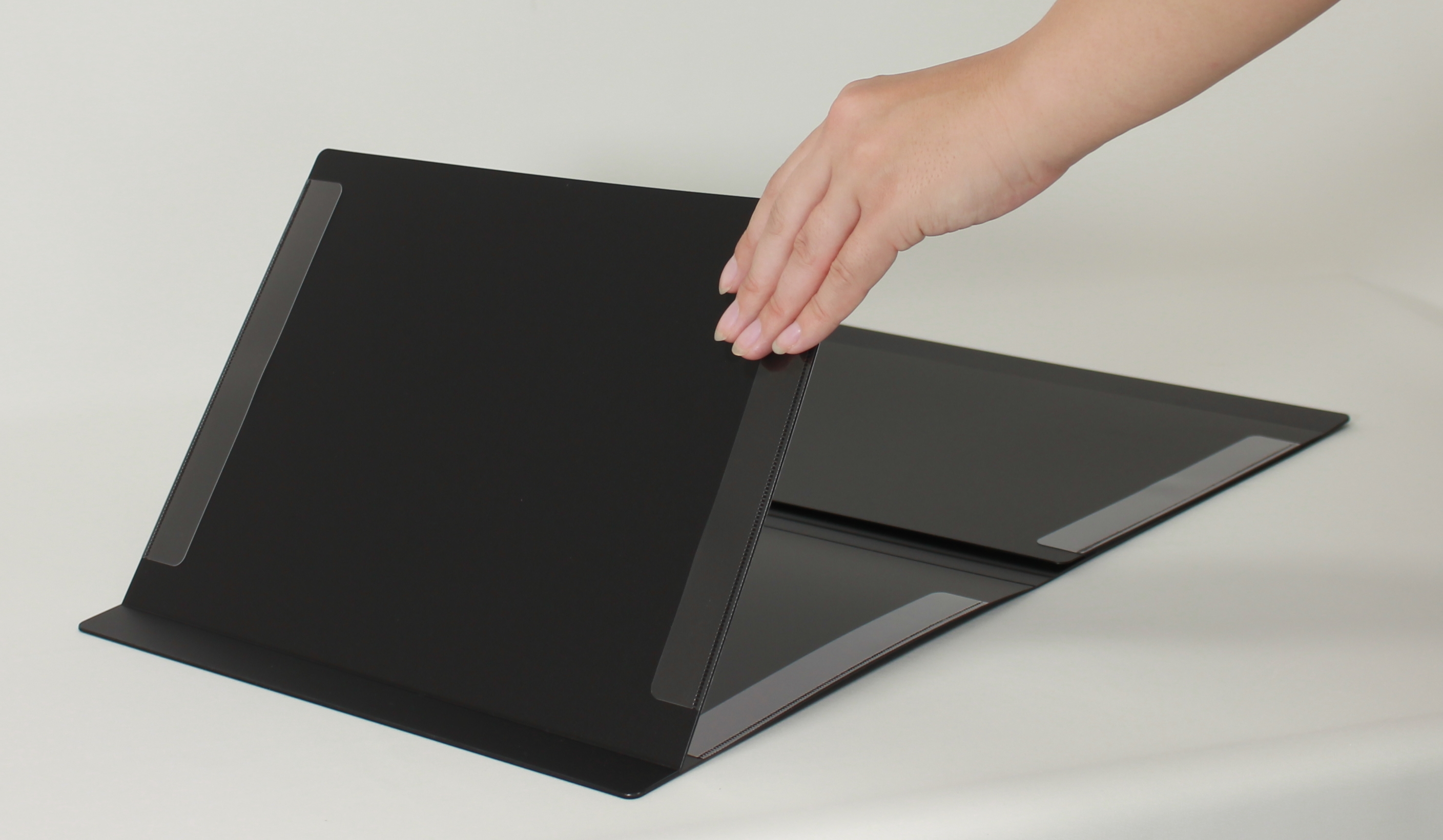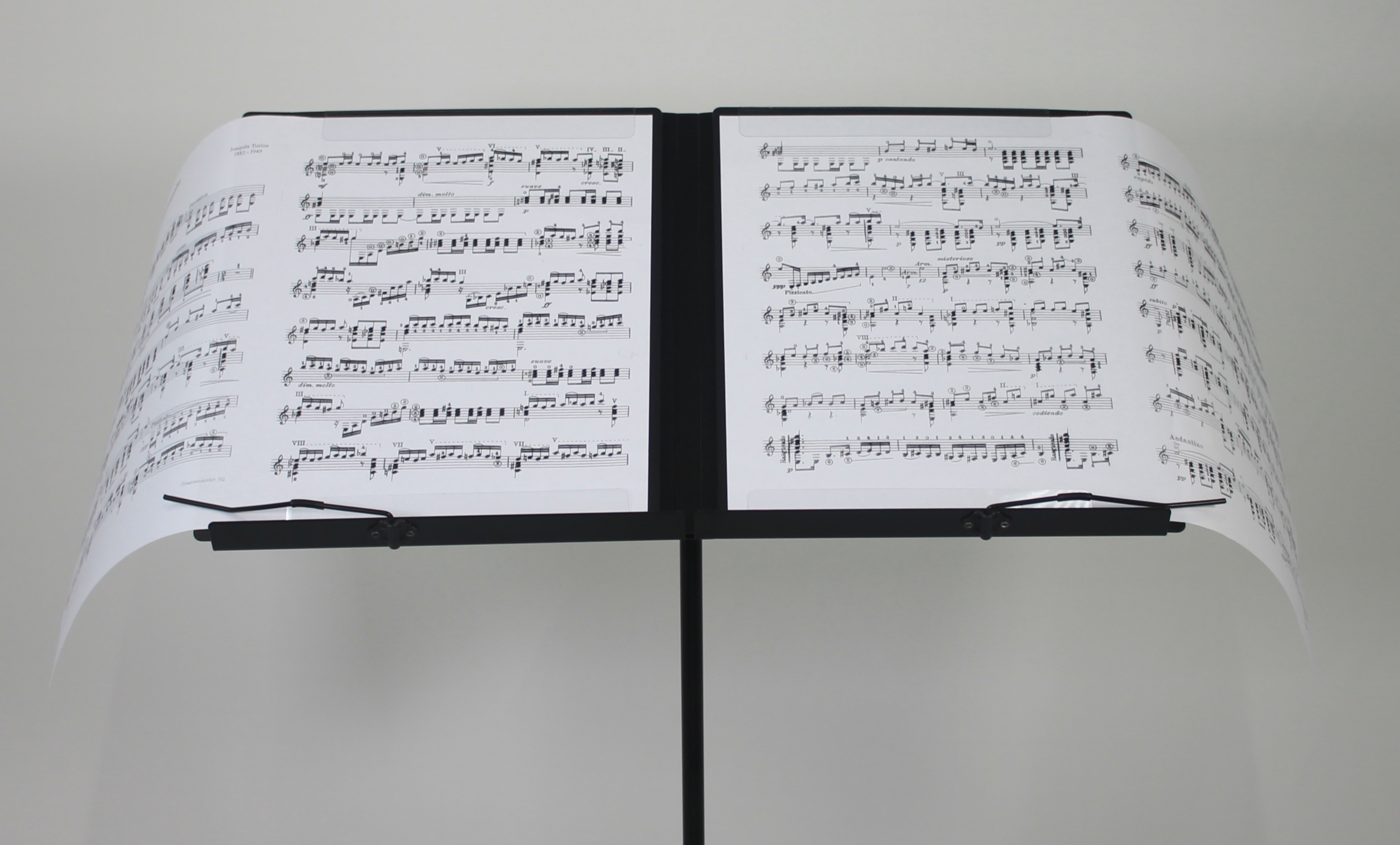 最大A4を4枚、A3を2枚見開きでセットすることができ、譜面台に立てても両端が垂れ下がることがありません。