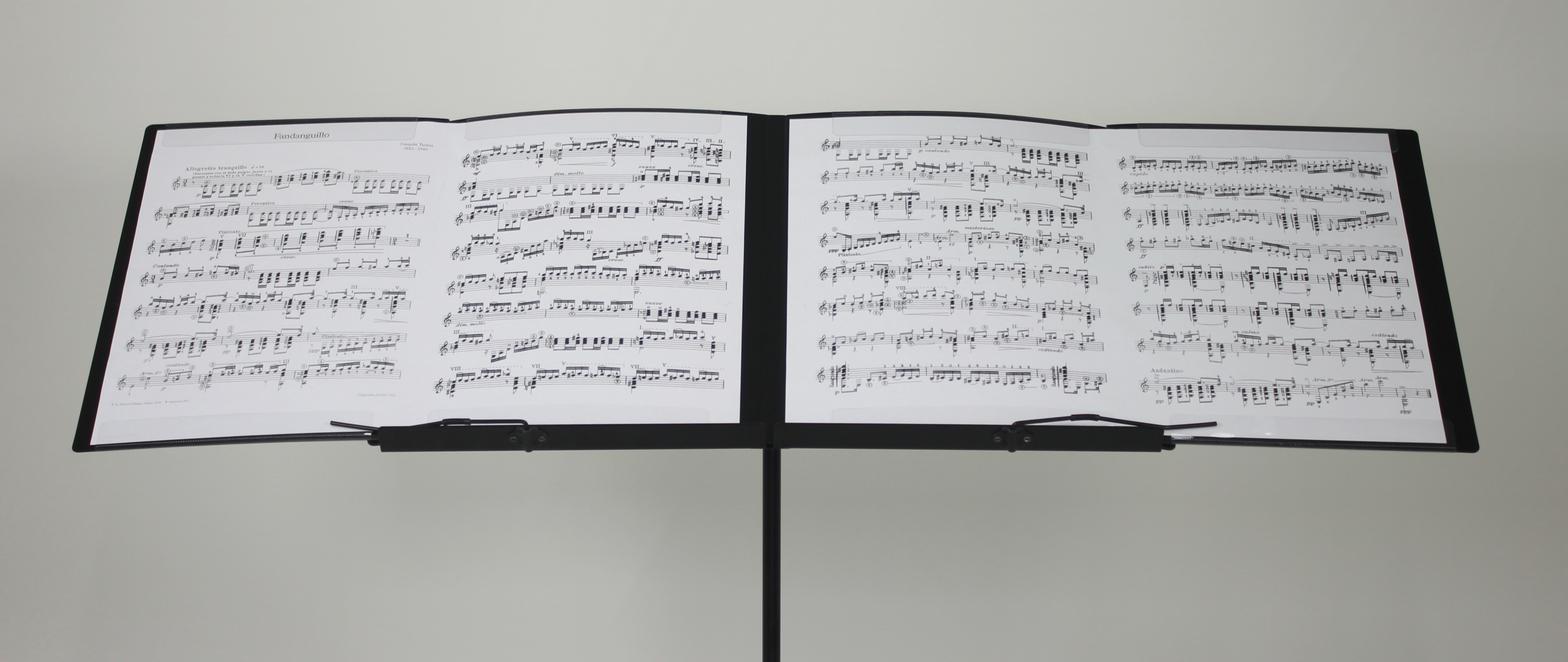 昨年秋に発売した「SHIROKUMA リング楽譜ファイル」と同じ機能を持っていますが、リング式ではなく、各面の上下の高透明な用紙止めに楽譜を挟み、しっかりと固定して使います。