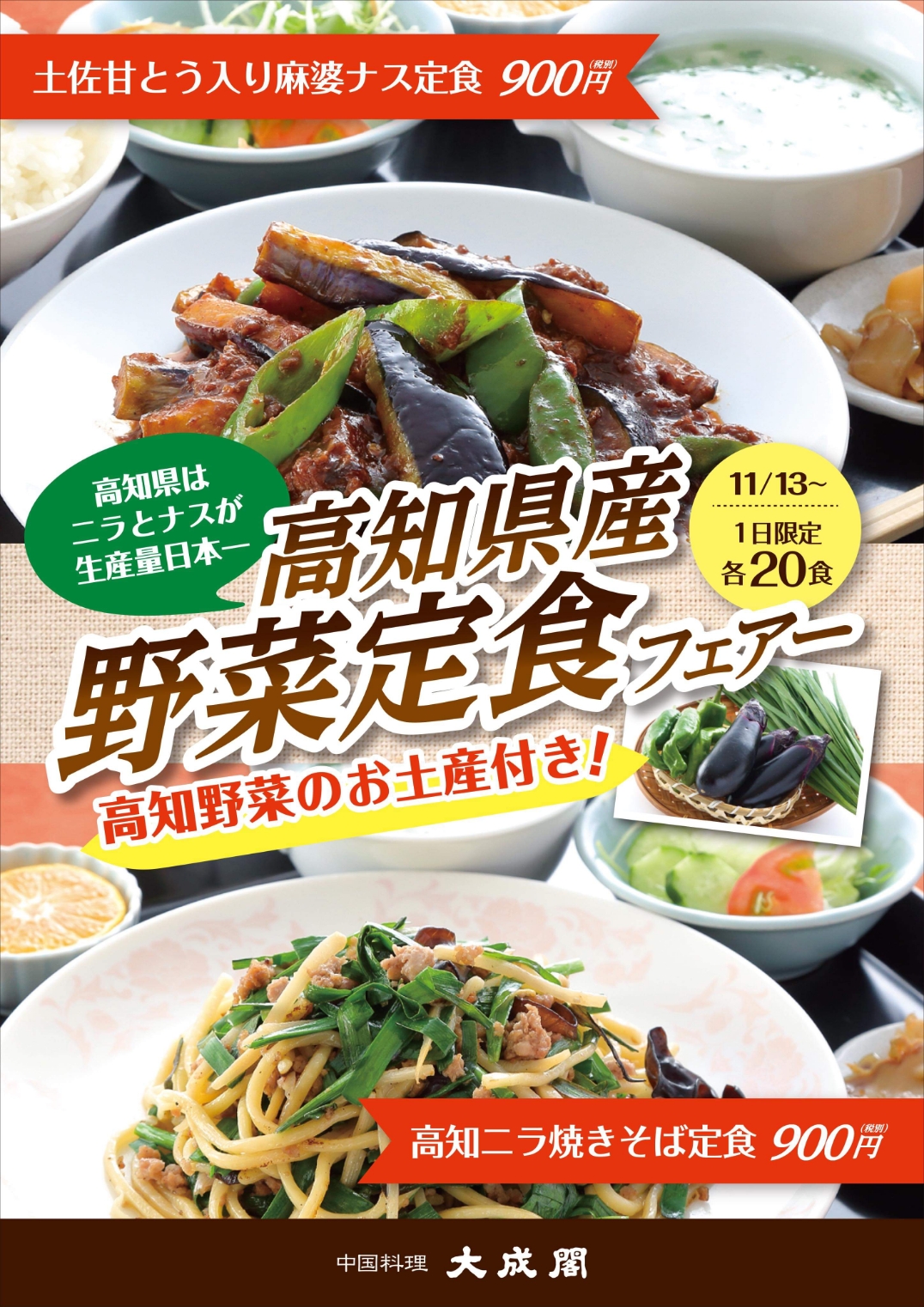 各1日20食限定 ご注文いただいた方には高知野菜1種をプレゼント