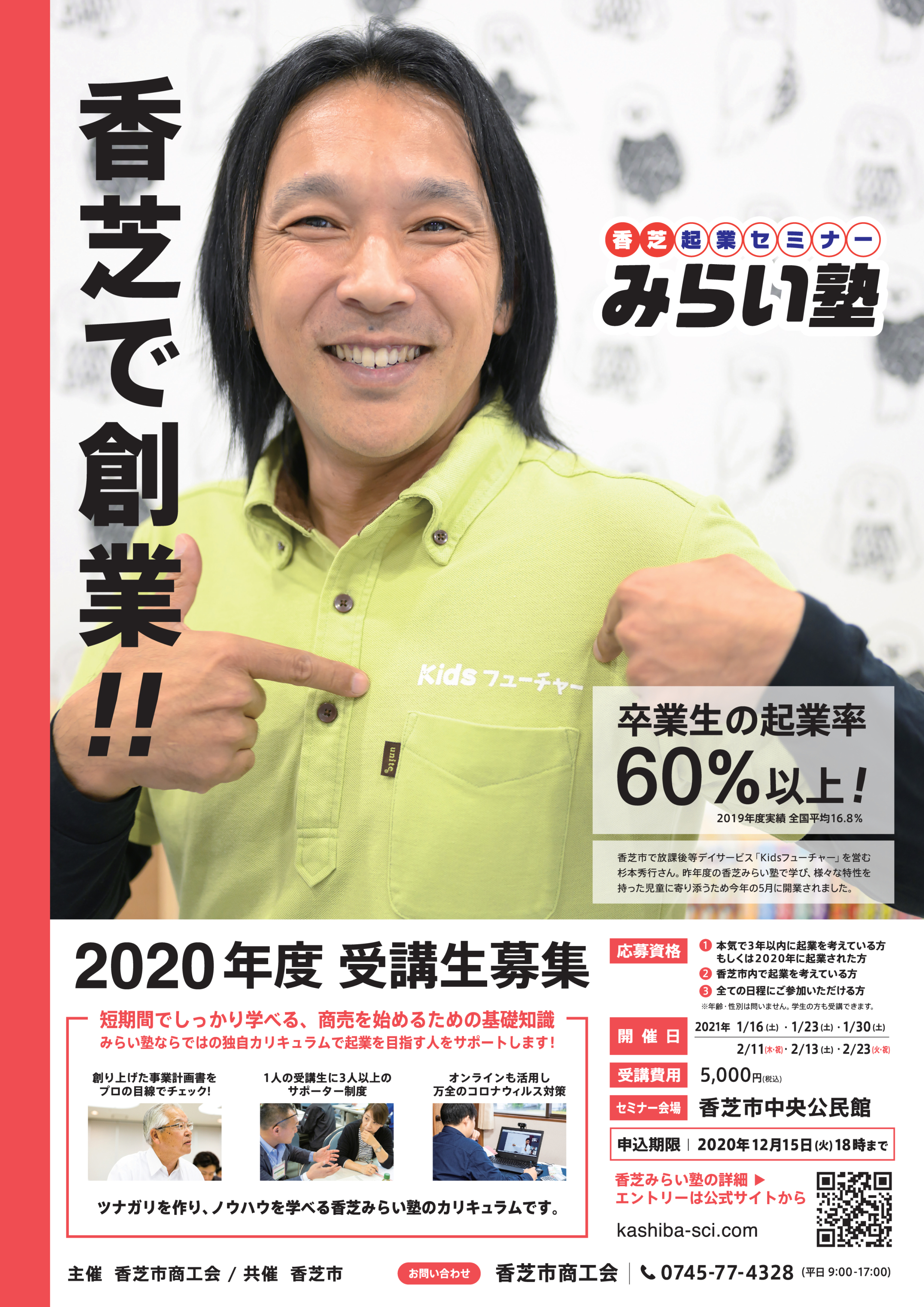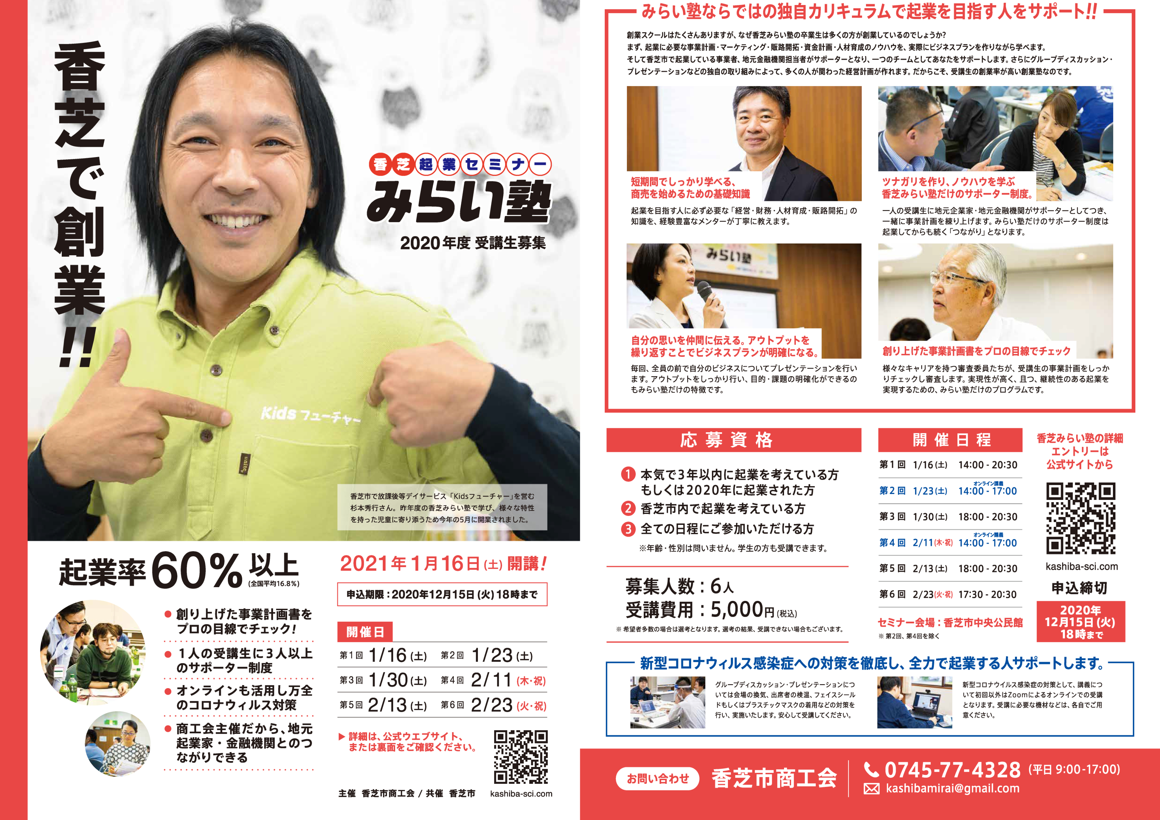 香芝市商工会(所在地:奈良県香芝市)は、香芝市で創業を考えている方のための起業セミナー「香芝みらい塾」の2020年度の受講生を募集していることを、ご報告いたします。