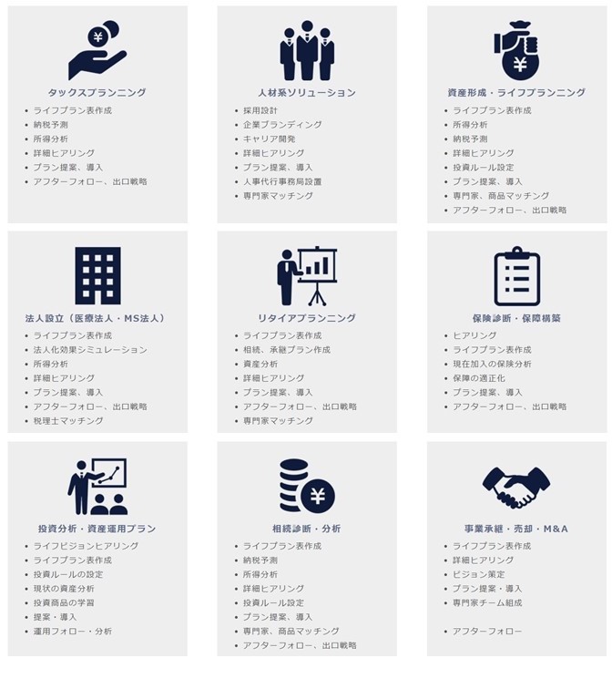 事業内容:医師・歯科医師専門の人生設計支援サービス(「理想の人生設計のプラン実現を通して、幸福やQOLを追求する」ことをコアバリューとしたライフプランニング及びそれらに付随するあらゆるソリューションを提供)
