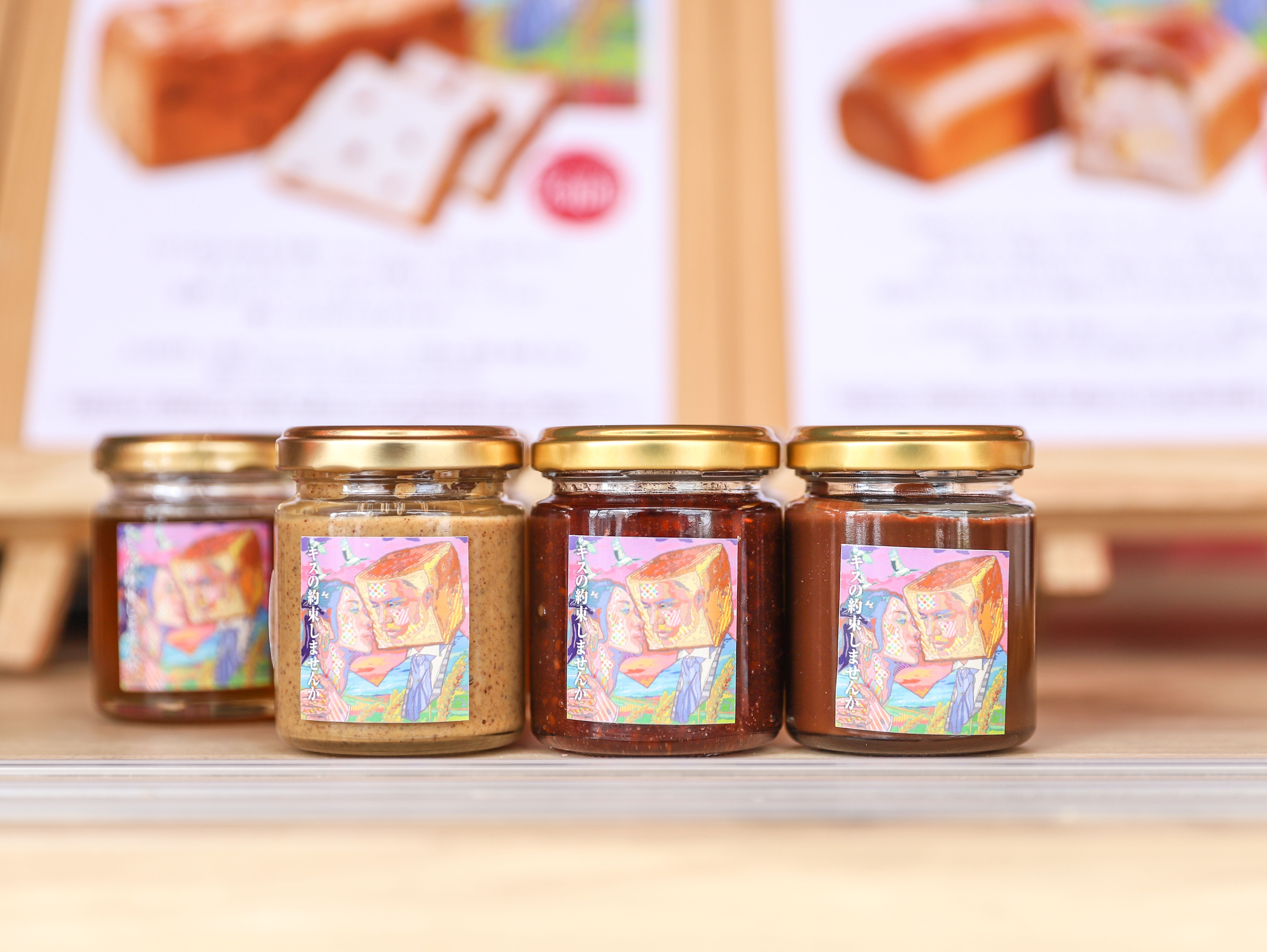 オリジナルブレンドコーヒー1P 200円・3P 550円/エコバッグ 3,500円/ CD 1,500円/缶バッチ 300円/パンナイフ 800円/ Tシャツ 3,500円/スプレッド類(オリーブ&チーズ、カレー&オリーブ&チーズ、チョコレートスプレッド、ピーナッツペースト、ミックスベリージャム) 各800円/コーヒー蜂蜜/ブルーベリー蜂蜜/レモン蜂蜜 各900円