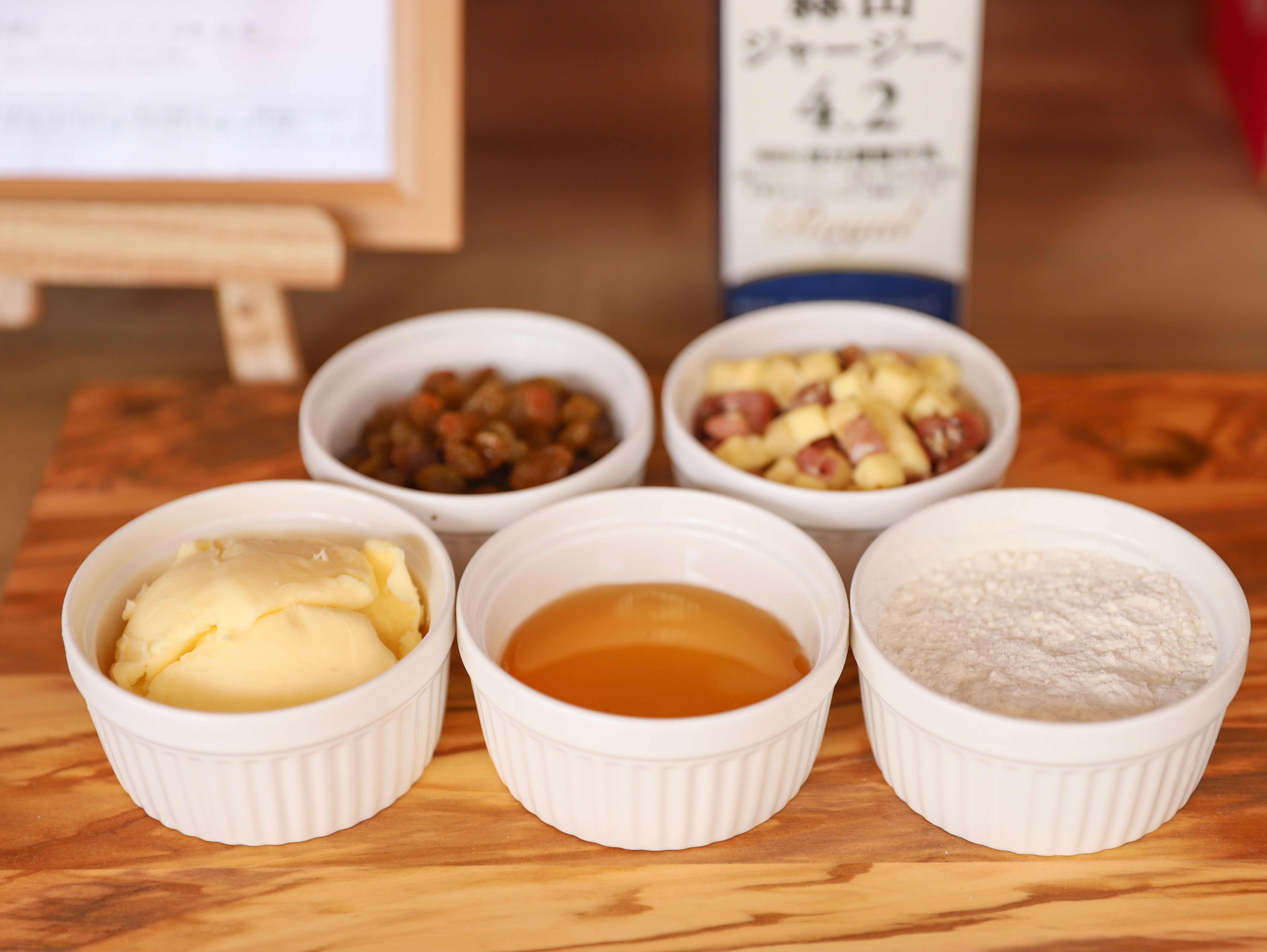 主な原材料:小麦粉、サンマスカットレーズン、乳製品、砂糖、はちみつ、塩、他
