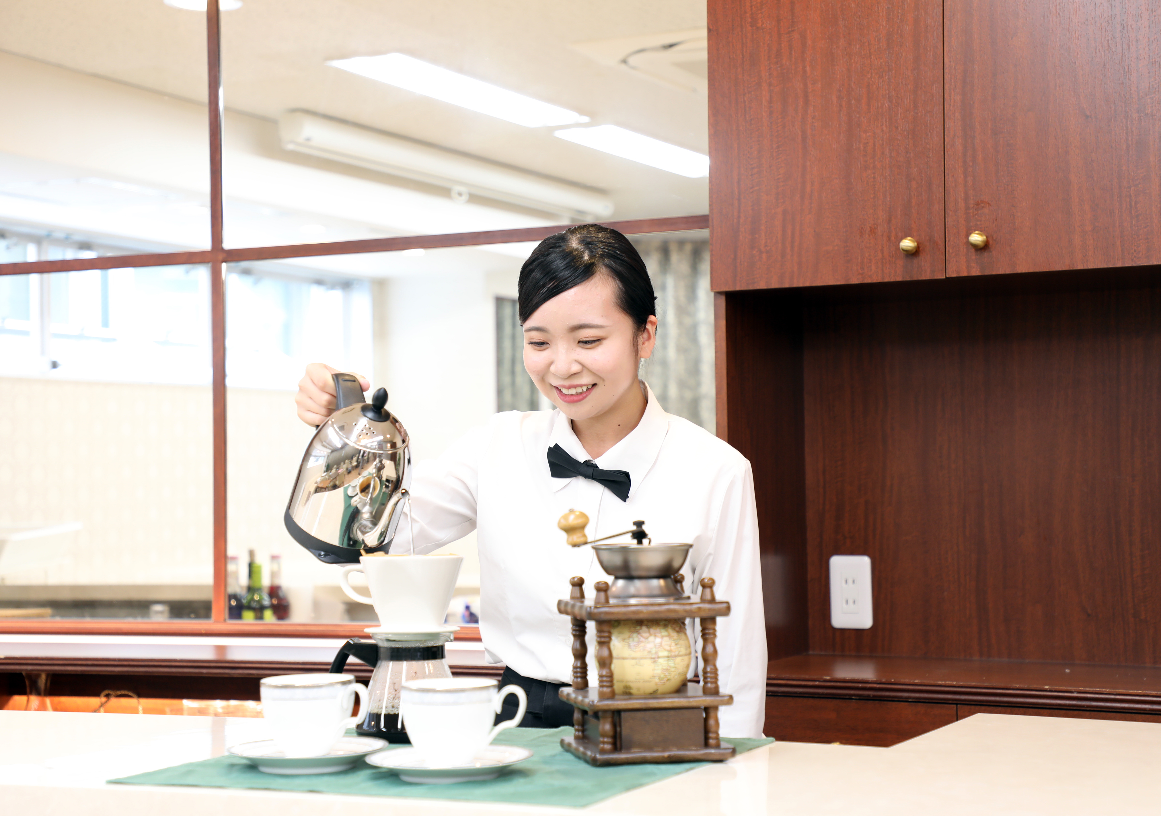 在学期間に学んだ接客技術でお客様をお迎えし、一杯一杯丁寧にドリップしたコーヒーを提供いたします。カフェの売上げは、災害復興支援金として福島県へ寄附します。カフェには「ふくしま銘産品市」を併設し、学生が選んだ福島銘菓や日本酒、りんごやお米を販売。福島県産品の安全性と美味しさをPRします。未来のホテリエが創り出す、心温まる「つながり(Rapport)」の空間をご体感ください。