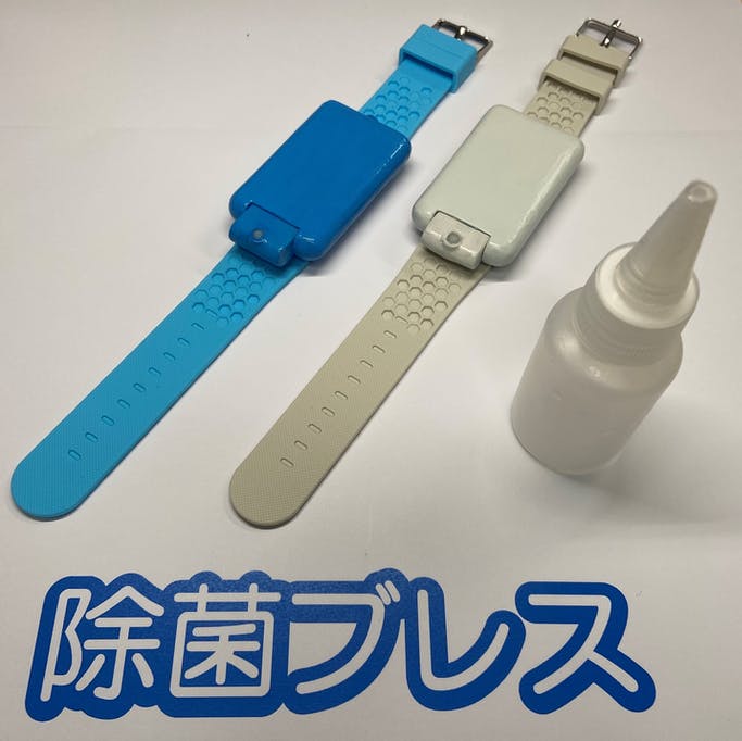 そこで、社内会議で「持ち歩きがしやすく、持参するのを忘れない消毒液の容器があればいいのに」ということを話したのですが、そこで出てきたアイデアが「リストバンド式の消毒液容器」でした。