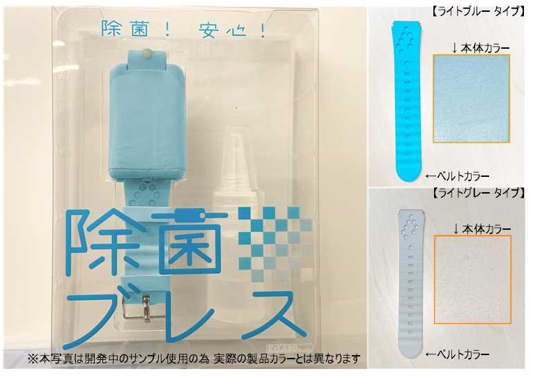 株式会社ケーズラボ(本社:京都市左京区 代表取締役:鈴木克弥)では、この度、リストバンド型の消毒液噴霧器「除菌ブレス」を開発いたしました。腕時計の様に手首に巻いて使用できる消毒液の噴霧器で、ボトルタイプの物よりも小型・軽量で、持参するのを忘れる心配もありません。色はライトグレーとライトブルーの2 タイプを用意し、2021 年2月中旬より1 本1,200 円(税別・送料別)で自社サイトにて販売を開始いたします。また、2021 年1月18 日から、自社サイトでの予約受付を開始いたしますが、予約での先行販売分については、送料無料にて販売させていただきます。