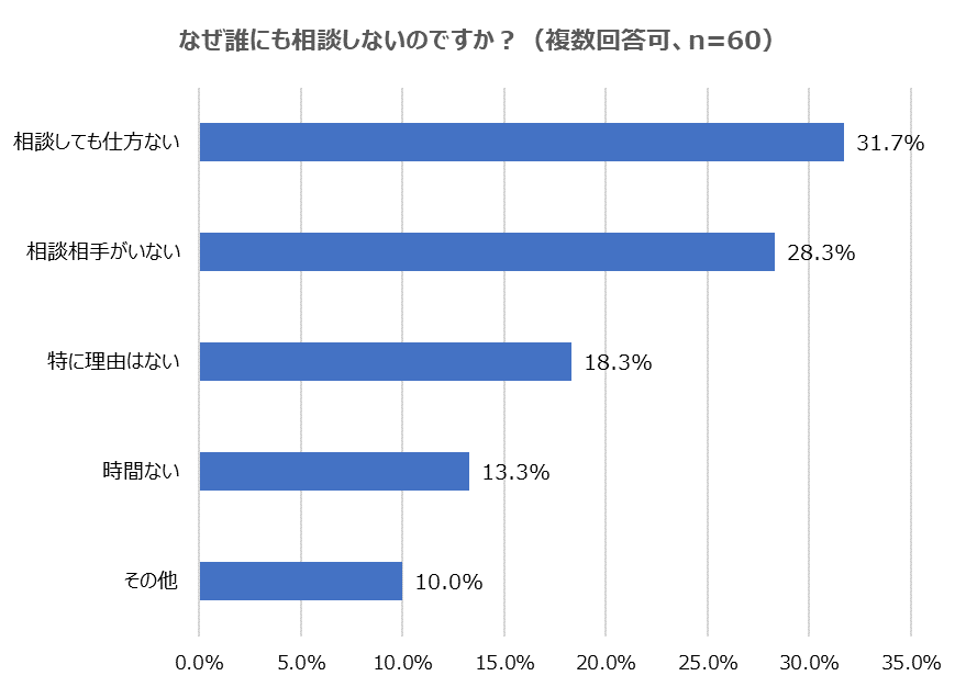 さらに、相談する相手がいない、相談しても仕方がないなどの理由で、悩みを一人で抱え込み、精神的ゆとりや経営面・金銭面での不安を解消できていないドクターが多くいることも判明しました。(図2参照)