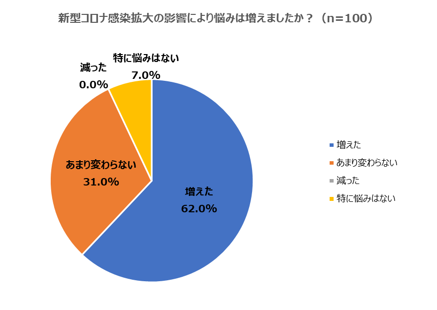 2020年12月に発表した当社の調査により、ドクターの62.0%が、新型コロナ感染拡大の影響で悩みが増加していることがわかりました。(図1参照)