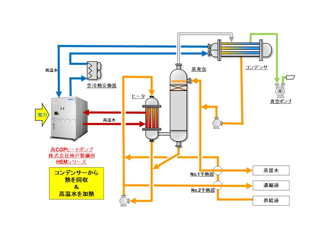 昨年度、当社はアンモニア回収装置に用いるために、株式会社神戸製鋼所(以下「神戸製鋼所」)と高加熱高効率ヒートポンプHEM-HR95-GNを共同開発しました。このたび、当社はこのヒートポンプを蒸発装置に応用し、高COPでの蒸発を可能にしました。