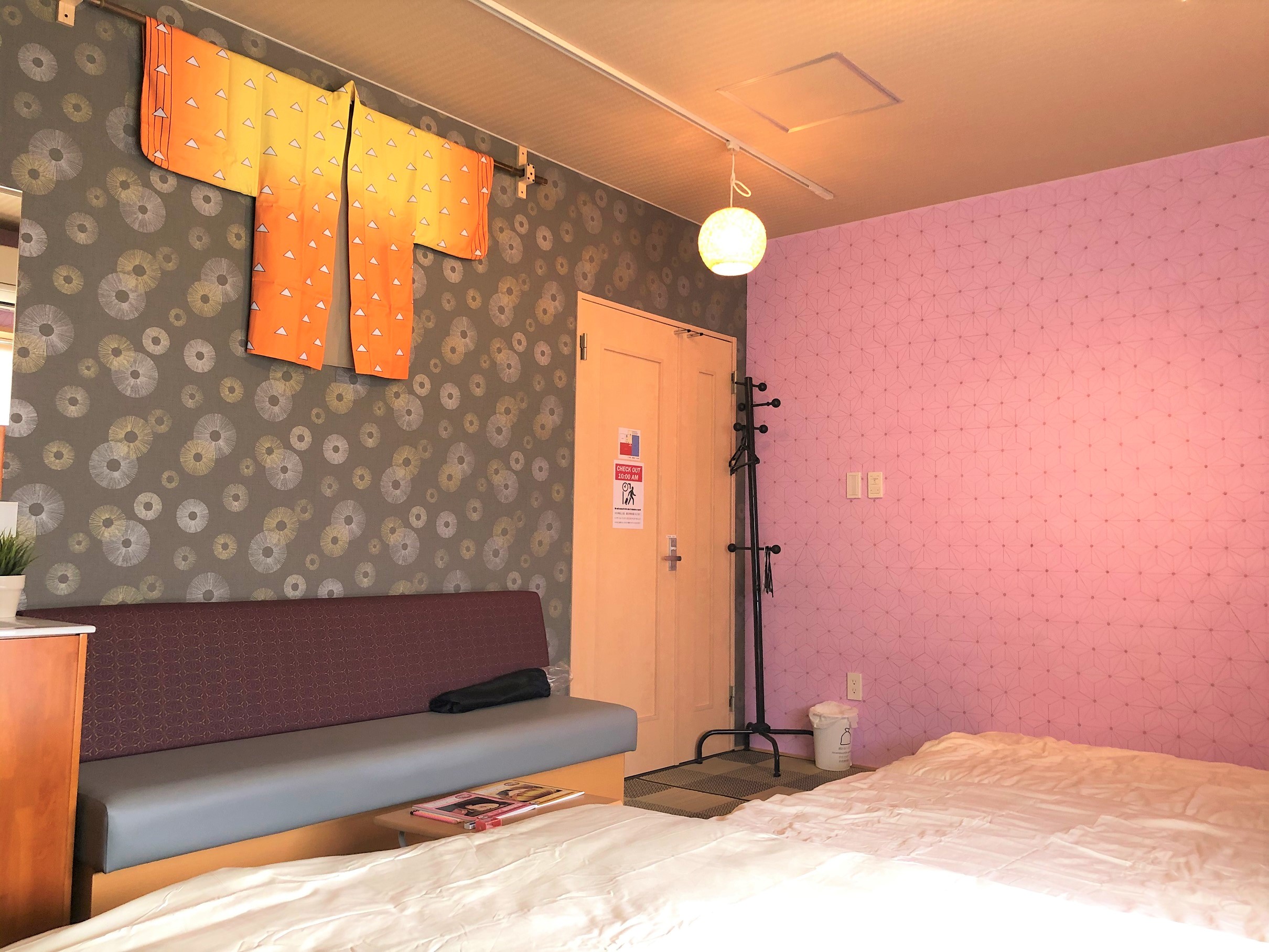 コロナ拡大以降、息抜きで利用いただける方が多かったことから、重苦しい空気を少しでも明るくしようと、通常1泊3万円を5,670(コロナ、ゼロ)円で提供するサービスを考えました。最大8人で宿泊できるので、1人あたりの宿泊費は約700円。清掃代を入れても2,100円程度で利用できます。緑と黒の市松模様が特徴的な男の子部屋と、黄色の法被とピンクの壁紙が可愛らしい女の子部屋を用意しております。緊急事態宣言の延長も検討され長引くことが予想されますので、コロナ疲れが出ている3府県の方に「ちょっとした息抜き」できるプランとして利用してもらえたらと思っています。駐車場完備、貸し切りなので他グループと接触することなく自宅から来場することも可能です。ご家族で泊まったり、あるいは受験生の最後の追い込み部屋としてなどお好みでお使いください。