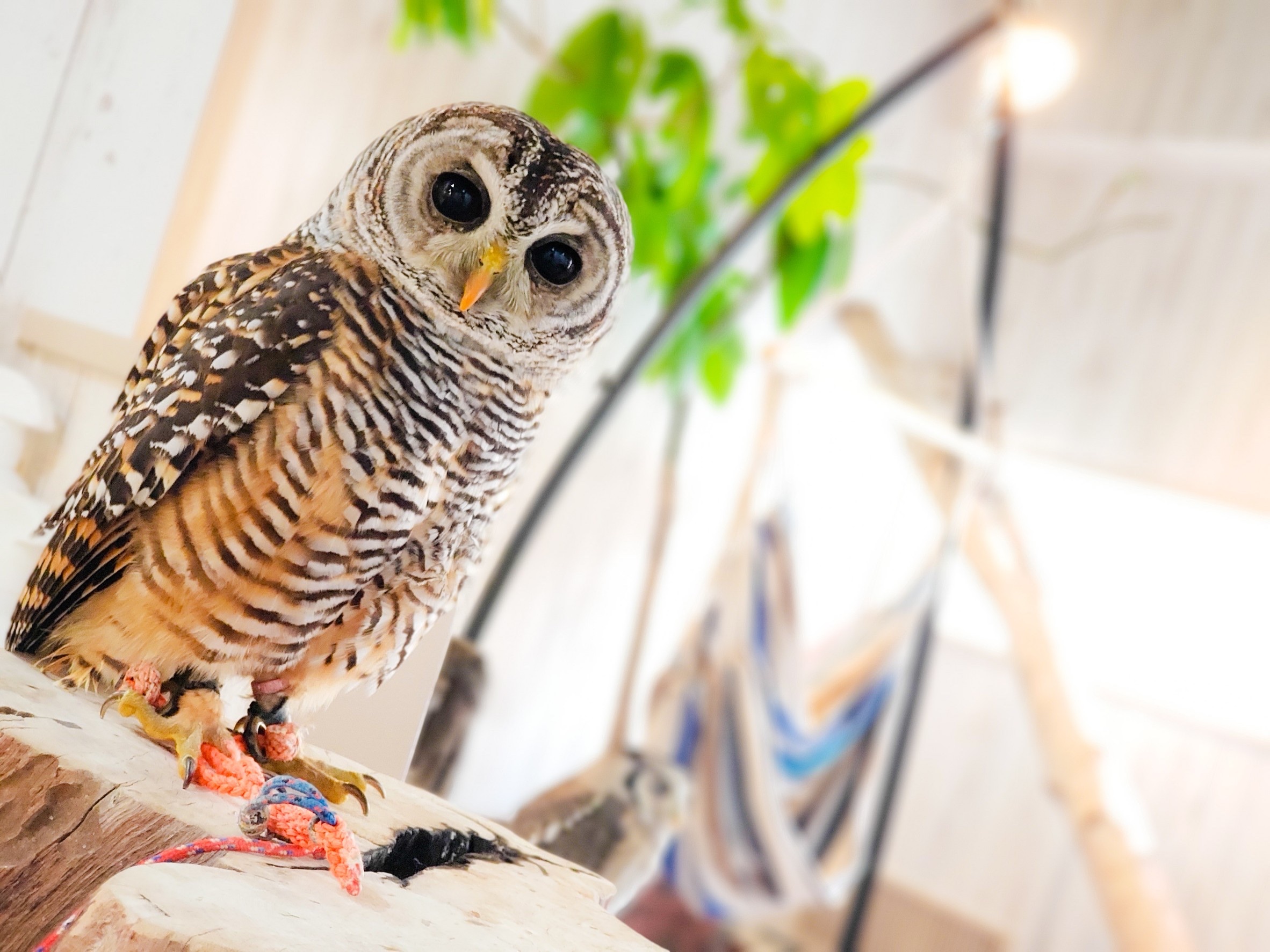 約 24 坪のお店には、関西ではここだけ!の真っ白なメンフクロウや、タカに会えるだけでなく、大型プレイジムやハンモック、キッズスペースがあって動物カフェでは珍しい設計。乳幼児から遊んでもらえるように、靴を脱いで楽しめるキッズスペースには、大人もちょっとやりたくなる知育玩具も設置しています。また、おむつ替え台、着替えスペースも完備しており、ご家族や親子で楽しめるようになっております。
