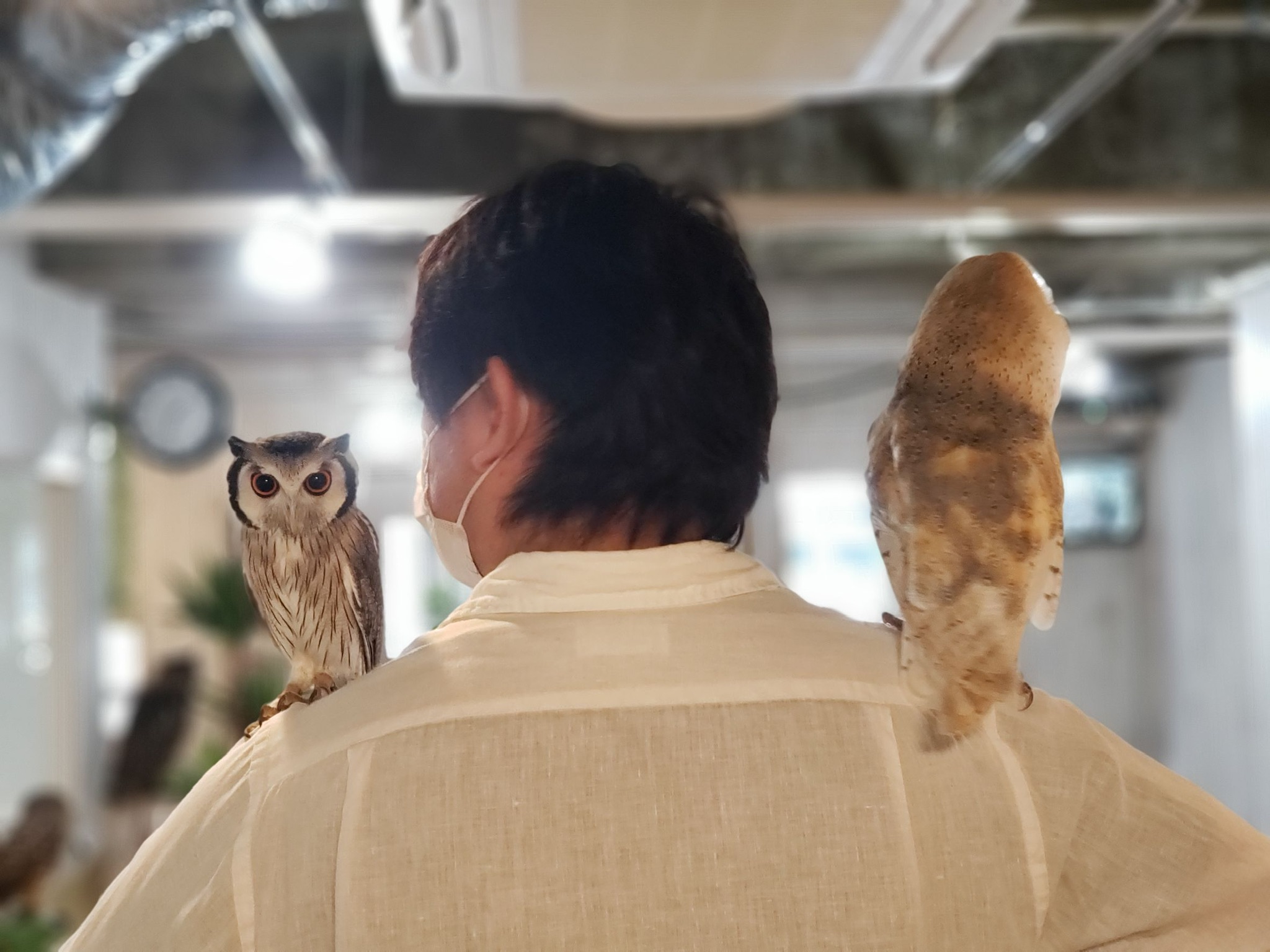 お客様がお借りしたフォトスタジオまで出張。その後、お客様にて撮影タイム。腕乗せ、肩乗せ触れ合いタイム。施設での触れ合い体験やフクロウについてのプチ講座。記念日フォトやウェルカムバードなど。柔軟に対応させて頂きます。ご利用料金はお店から出張先までの距離料金とフクロウの羽数で決めさせて頂きます。フクロウの出張費(15000~60000 円)+交通費(5km1500 円~)+その他かかる費用となります。緊急事態宣言中はコロナゼロ(5670)円引き実施中。お見積りは電話またはホームページよりお問い合わせください。 オーナーは小学生の頃にアヒルを飼ったことが、動物に携わる仕事がしたいと思うきっかけに。高校卒業後は動物の飼育など業界のことが学べる専門学校に進み、その後、バードシ ョーのトレーナーやペットシッター、動物飼育などの専門学校の講師、フクロウカフェの店長など経験しました。また、関西にとどまらず山梨県にある乗馬クラブで勤務していたこともあり、どこへでも、やりたければ飛んでいきます。現在自宅でネコ 3 匹飼っていますが、この子たちは山で乗馬中に出会い、保護してそのまま一緒に暮らしています。長年動物と触れ合ってきたオーナーが、皆様を動物の力で癒し、楽しませます。