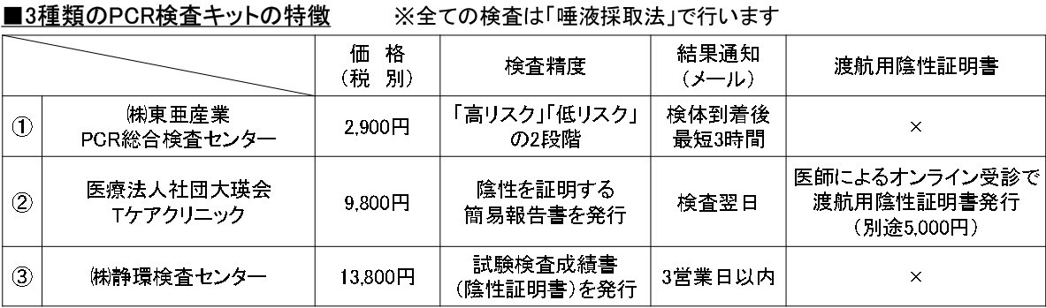 ■3種類のPCR検査キットの特徴 ※全ての検査は「唾液採取法」で行います、価格は全て税別
