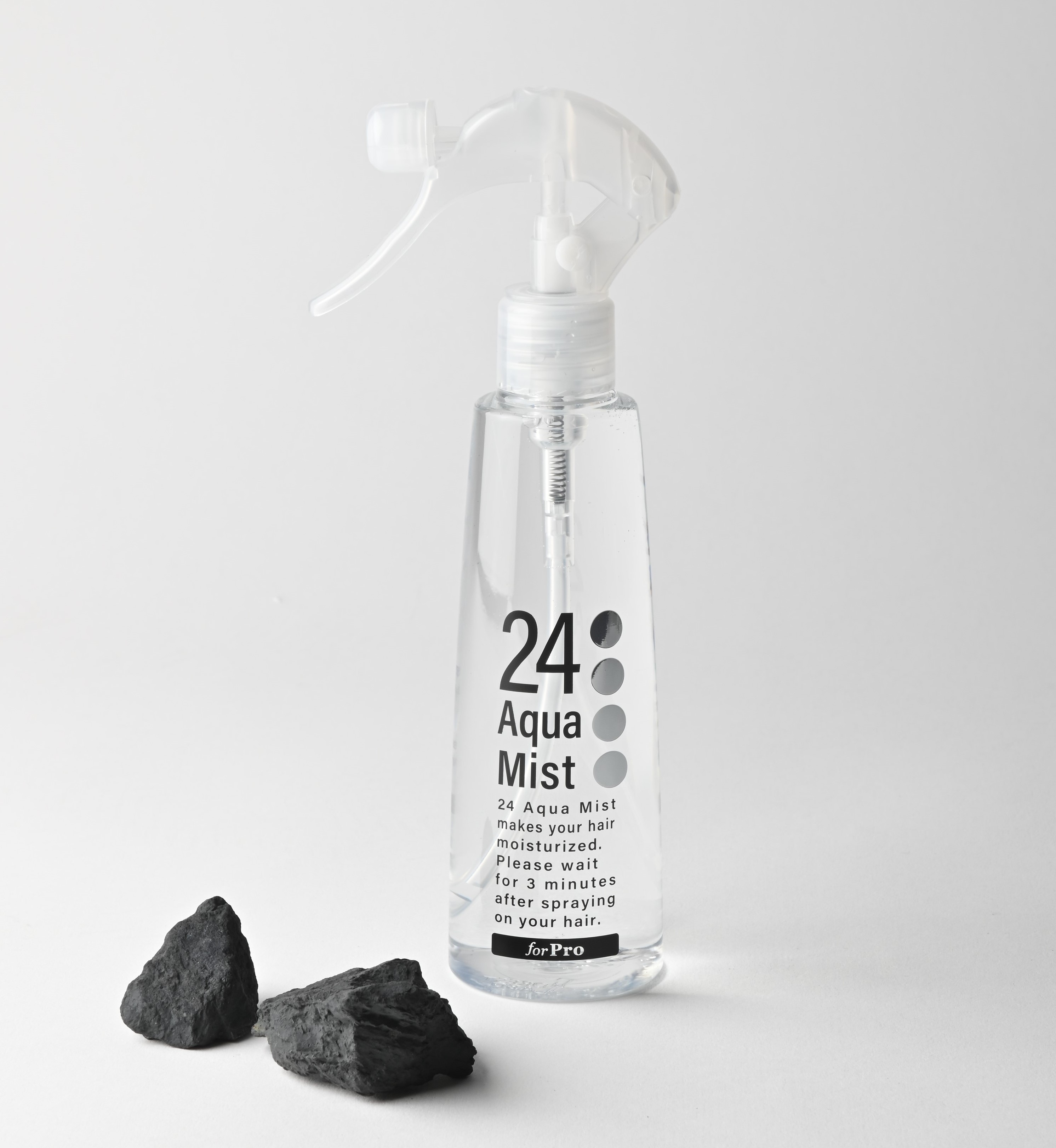 「24 アクアミスト」は毛髪診断士の資格を持つ代表の中村仁美が、自身の極度のくせ毛のため月1回繰り返した縮毛矯正とヘアカラーによる髪の痛みの悩みを解決するために、医学博士と共同開発したヘアケア商品です。大学などの研究室で細胞や血液を培養する際に使われる不純物が一切含まれていない「超純水」に、北海道檜山郡上ノ国だけで採取される鉱石「ブラックシリカ(ケイ素)」を漬け込み、天然のミネラルを浸出させました。超純水の水分子は不純物を含まないため0.3ナノメートルと小さく、0.5~1ナノメートルのキューティクルの隙間から髪の内部に浸透することができます。髪内部にある繊維状のたんぱく質でできた層(コルテックス)が潤うことで、カラー剤の浸透力が高まり、放置時間を通常の半分の時間に短縮することができます。その上、含まれるケイ素によりアルカリ性のカラー剤を中性化することで、髪や頭皮へのダメージが軽減されます。