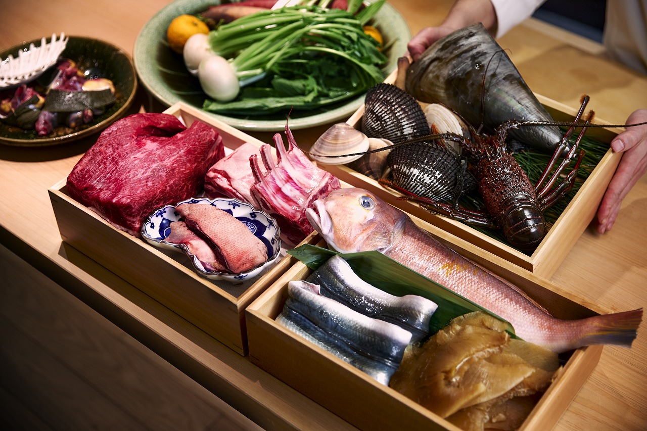 決まったコースを提供するのではなく、お客様のお好みのネタをお好みの調理法でご提供するのが新しい割烹スタイル。先付から始まり、その後ネタ箱から本日の造り3~4種類、焼き物、揚げ物3~4種類という流れで、〆(しめ)では、5種の麺や飯メニューより選ぶことができます。まさに割烹の名の通り食材を「割(さ)き、烹(に)る」。料理の価格は20,000円。ソムリエが選ぶペアリングの日本酒も別途ご用意いたします。