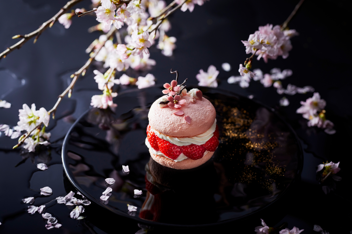 チーズのムースとグロゼイユのゼリー、桜風味の生クリームの周りにあまおうのフレッシュいちごをまとわせ、ふんわりと桜色に染まったマカロンでサンド。フレッシュいちごの甘酸っぱさ、なめらかなチーズのムースとグロゼイユの酸味、それらを包み込む桜風味の生クリームがふわっと口いっぱいに広がる、春を感じる上品な一皿です。