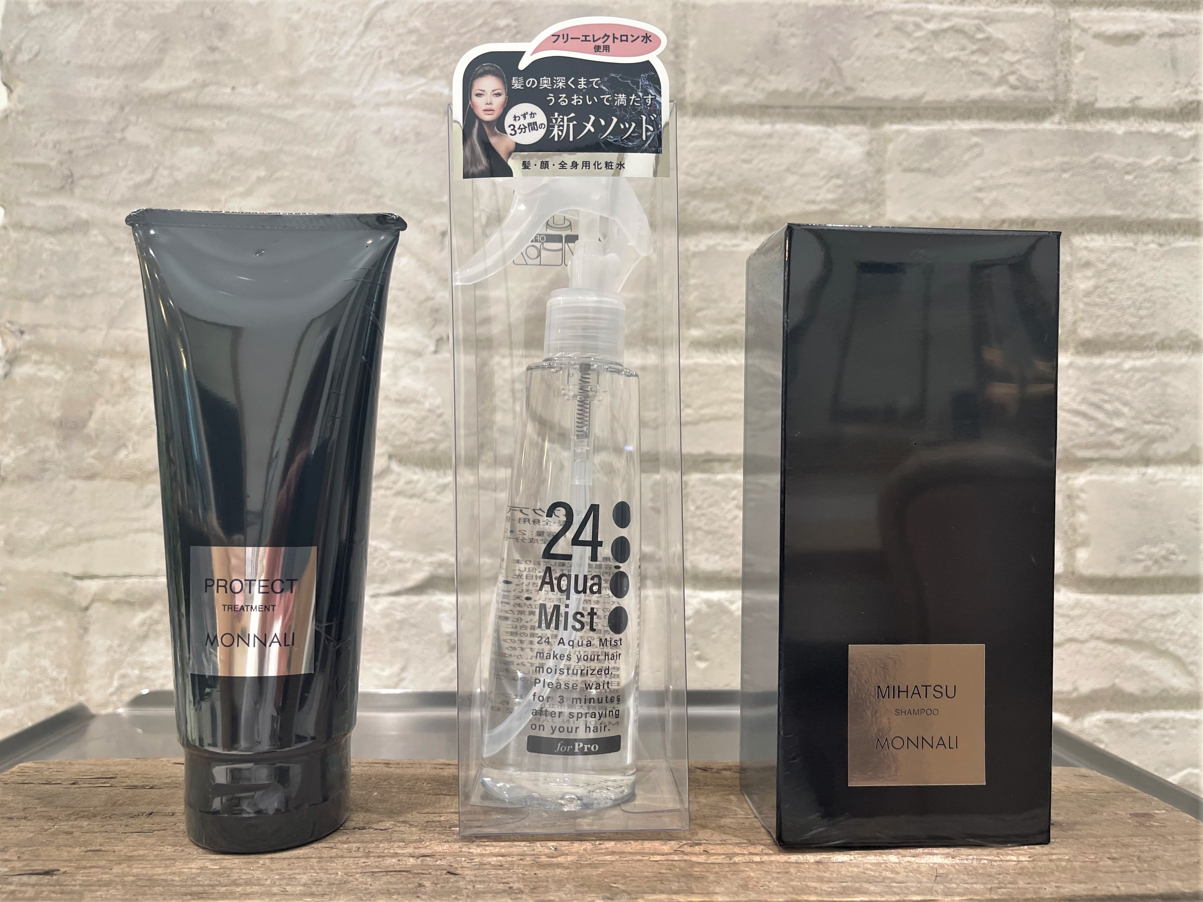 石油系合成界面活性剤、シリコン、パラベン、合成着色料、化学香料、鉱物油を使用しない「モナリブラックシリーズミハツシャンプー・トリートメント」、髪内部のタンパク質を復元するヘアミスト「24 アクアミスト」を使い、毎日のヘアケアから頭皮や髪に負担をかけず発毛を促します。