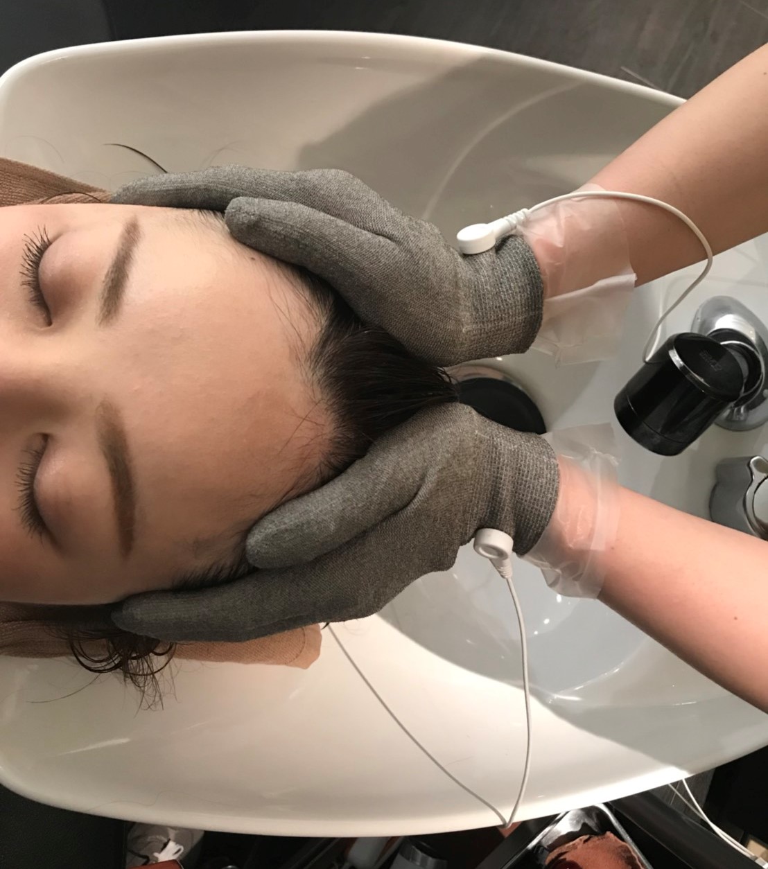 頭皮の汚れを超音波(スクライバー)で落とした後、微弱な電流が発生する特殊グローブを使って頭皮をマッサージします。血液循環の滞りやむくみを解消し、アンチエイジングにも効果的です。その後、超音波で頭皮に発毛剤を浸透させ、毛根を活性化させるパックを行います。