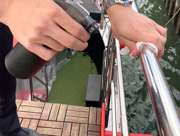 ●船内(手摺、テーブル、カラオケマイク、船内備品など)では、適時(出航前後・運航中)アルコール消毒を行っています