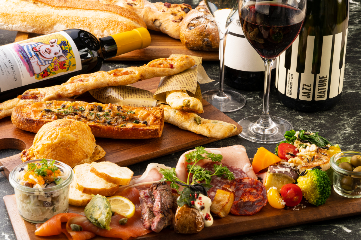 オフィス街梅田でのランチタイムや買い物途中のカフェタイム、大切な人とのディナータイム、帰宅途中のテイクアウトなど、様々なシーンでご利用いただけるよう、パンのほかフード、スイーツ、ワインを充実させました。ワインは日本を代表するトップソムリエがセレクトしたものを中心に、都内700店舗以上との取引によって実現した高コスパワインをご提供いたします。グラスは女性店長のセンスで選んだ数種類の「一目惚れグラス」の中からお好きなものをセレクトいただけます。