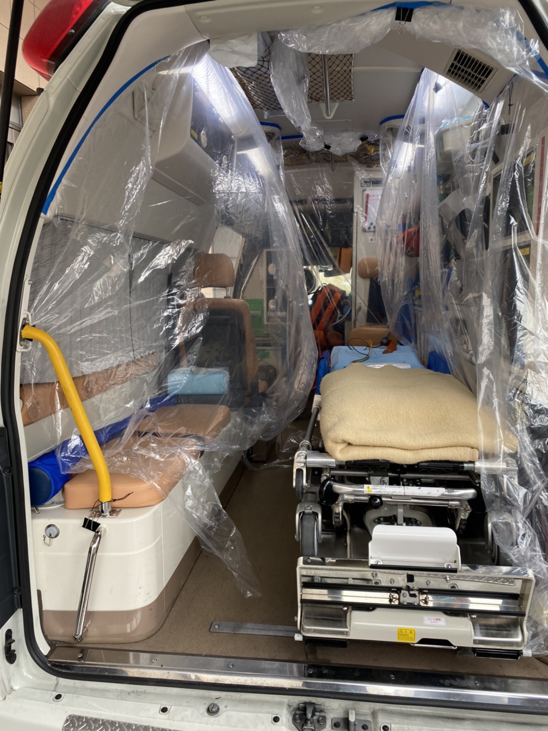 当社では2019年10月より中古のハイエースをベースにした救急搬送車の製造を行っており、地元の堺市のみならず、全国で21台を納車しております。コロナウイルス感染症の拡大以降、救急搬送車のニーズが高まっているだけでなく、救急隊員を守るための感染防止カーテンのニーズも高まっています。さらにはワクチン接種会場における飛沫防止のためにも、安価で使い捨てができるビニールカーテンが注目を集めています。