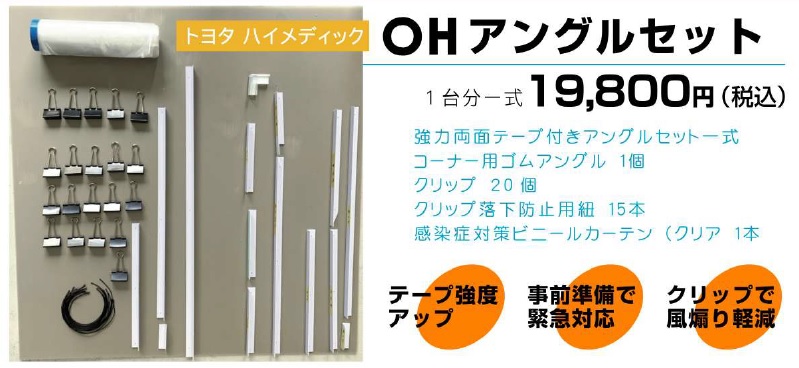 救急車として一般的な車種である「トヨタ ハイメディック」に簡単に取り付けることができる「OHアングルキット」(1台分=19,800円)は、「感染症対策ビニールカーテン」と「OHアングル」とがセットになっており、このセットだけで1台分の救急車に対して、新型コロナ感染症防止カーテンを設置できるものとなっております。