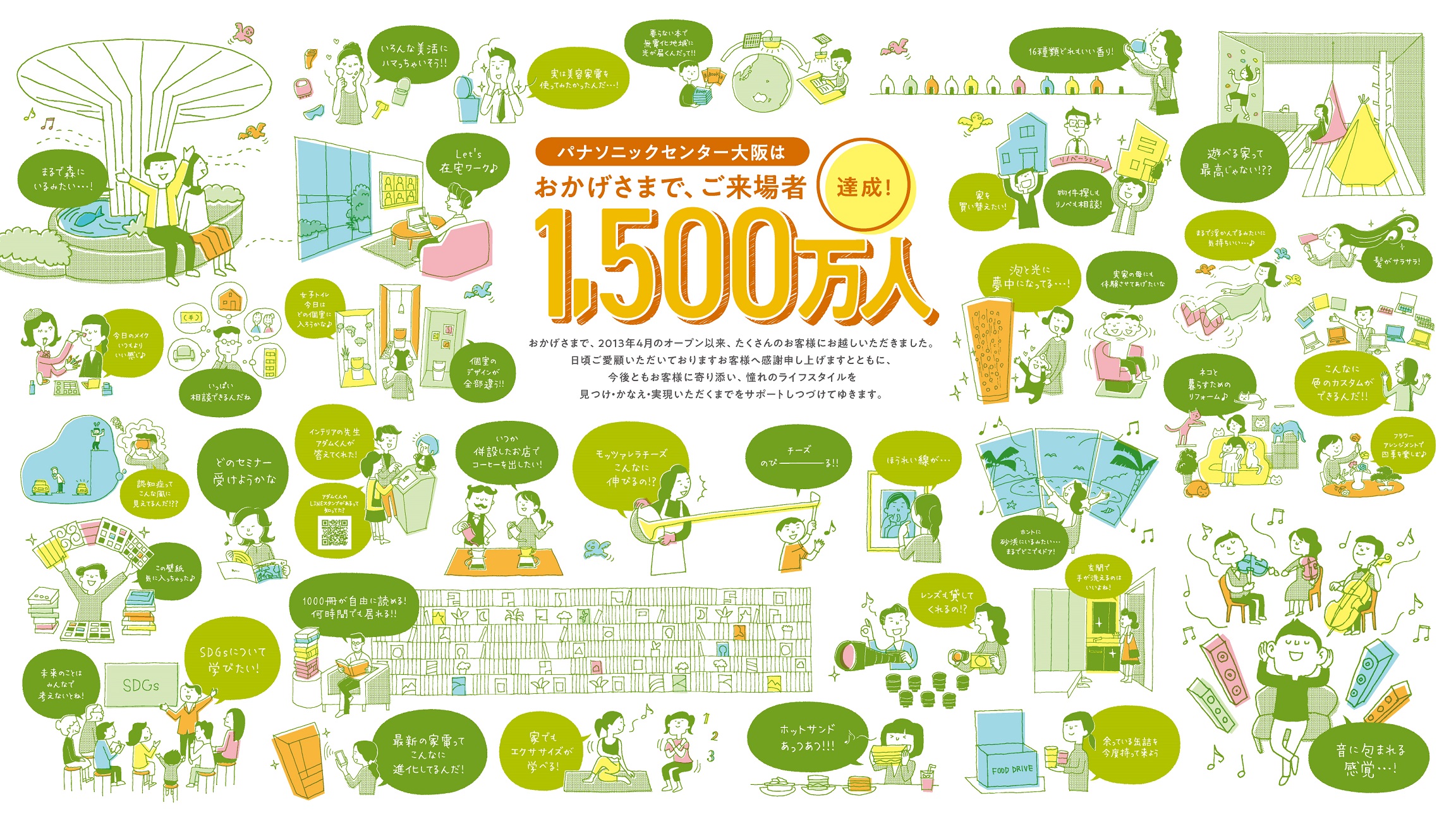 2021年3月3日~5月31日までの約3か月間新型コロナウイルスの影響で休館となりましたが、こうして無事に1500万人目のお客様をお迎えできたことに喜びを感じています。これもひとえに、感染対策を徹底してのセミナーやワークショップ等に足を運んでいただいたお客様の支えがあってのことだと感謝しています。今後も安心して楽しんでいただける施設を目指し、お客様一人ひとりの“くらし”に寄り添い続けて参ります。