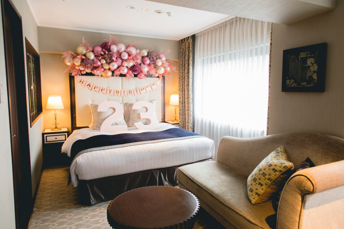 レストランでのお祝いはありきたりだと感じる方、特別感のあるかわいらしい装飾のお部屋でお祝いをしたいけれど良い場所が見つからない方などにぴったりなコンセプトルームです。ホテルメイドのケーキ付きなので、お部屋に着くまでにこっそり準備をする必要もありません。扉を開けるまではコンセプトルームとはわからない仕様なので、サプライズでのお祝いも可能です。バースデームードが漂う特別なお部屋で、大切な人と心に残る記念日をお過ごしいただけます。