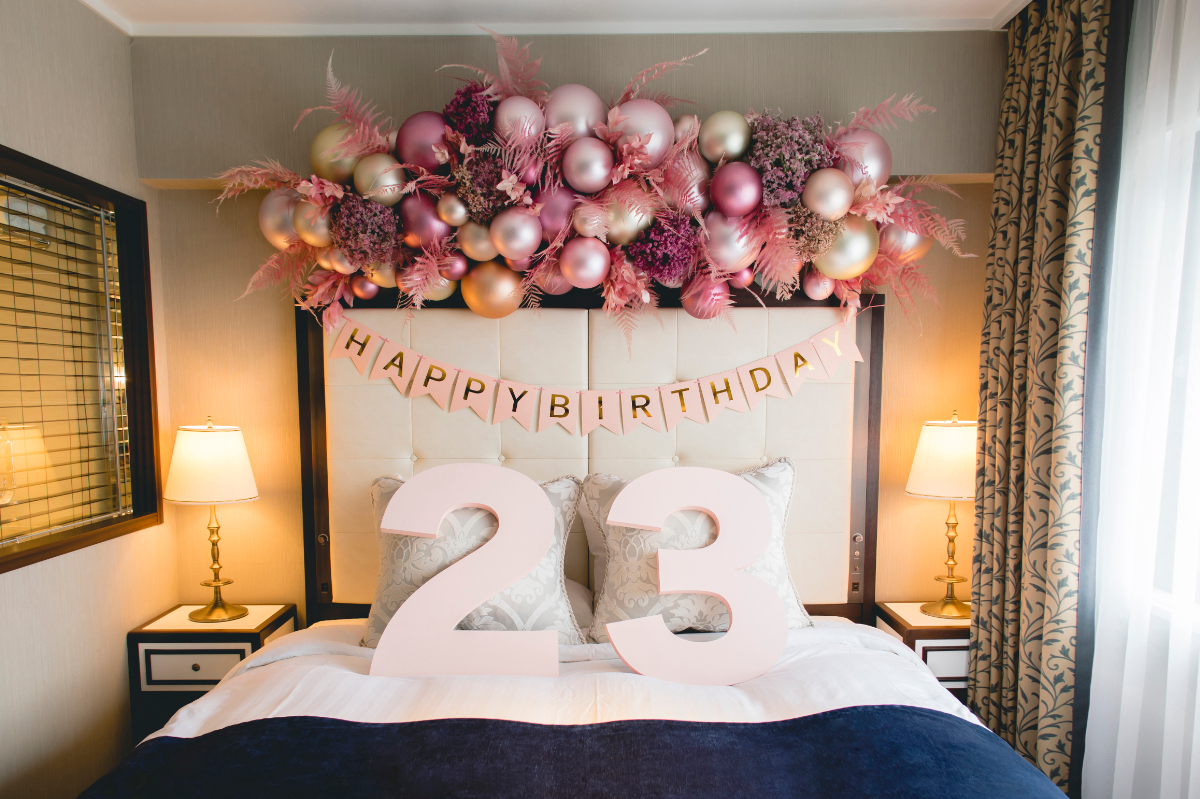 テーマカラーをピンク色でまとめ、装飾全体に統一感を出しました。淡いパステルカラーだけではなく、落ち着きのあるシックなトーンやパール感のあるカラーを中心に装飾しているので、大人っぽく華やかな印象を与えます。ベッド周りを中心に飾られた頭上に広がるドライフラワーを組み合わせたボールオーナメントやHAPPY BIRTHDAYフラッグ、お部屋に入るとまず目に飛び込んでくる大きな数字パネルがバースデーの特別感を演出します。