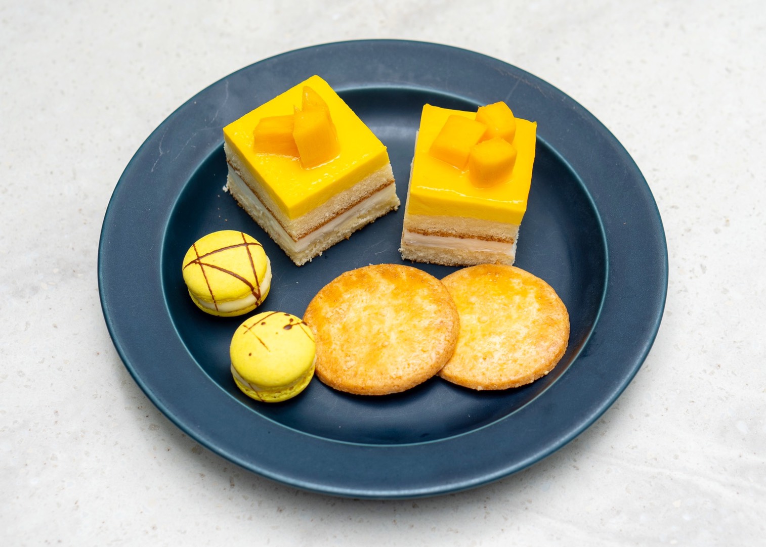 2段目には、滑らかな食感の軽いムースで仕立てたマンゴームース、爽やかなレモンクリームをサンドしたレモンのミニマカロン、芳醇な粉チーズの塩気としっかり焼き込んだ小麦粉の香ばしさが楽しめるチーズクッキー。