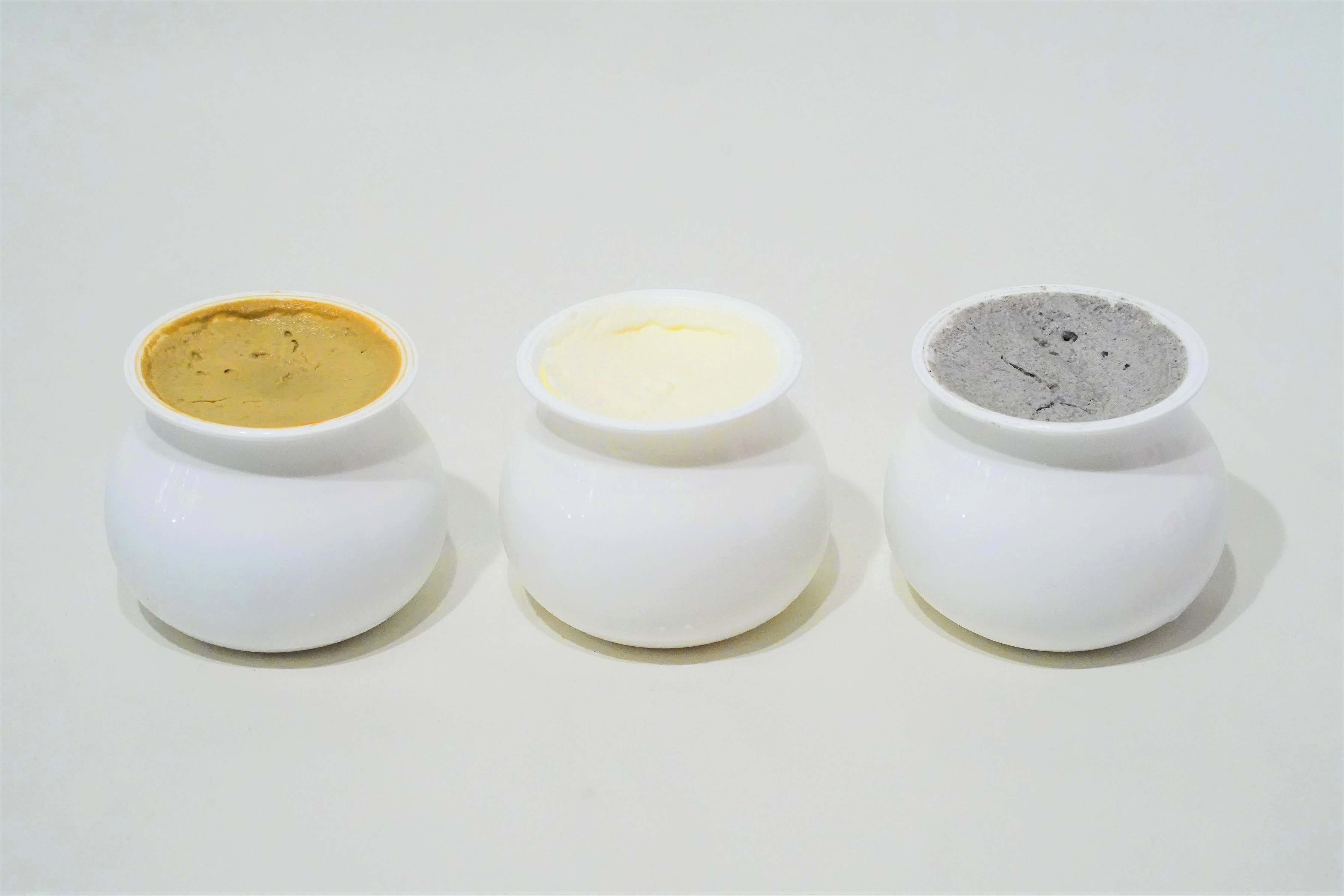 そのほか、カップに入ったわらびもちの上に生クリームをのせ、好みできな粉をかける「クリームわらびもち」(4個入り1,800円)は「プレーン」「ほうじ茶」「黒胡麻」の3種類をご用意しております。